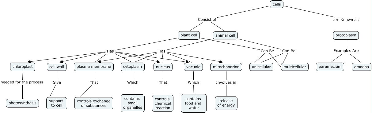 This Concept Map, created with IHMC CmapTools, has information related to: cells, animal cell Has nucleus, animal cell Has plasma membrane, plant cell Has vacuole, cells Consist of plant cell, plant cell Has cell wall, plasma membrane That controls exchange of substances, animal cell Has mitochondrion, plant cell Has plasma membrane, cells are Known as protoplasm, animal cell Can Be unicellular, cytoplasm Which contains small organelles, chloroplast needed for the process photosynthesis, protoplasm Examples Are paramecium, plant cell Has chloroplast, cell wall Give support to cell, plant cell Can Be multicellular, plant cell Has cytoplasm, animal cell Has cytoplasm, vacuole Which contains food and water, plant cell Has nucleus