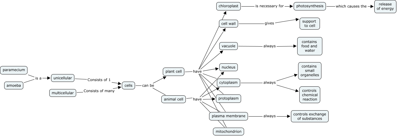 This Concept Map, created with IHMC CmapTools, has information related to: cells, cytoplasm always contains small organelles, cells can be plant cell, photosynthesis which causes the release of energy, plant cell have nucleus, animal cell have nucleus, animal cell have plasma membrane, cell wall gives support to cell, amoeba is a unicellular, animal cell have cytoplasm, chloroplast is necessary for photosynthesis, plant cell have cytoplasm, plant cell have mitochondrion, vacuole always contains food and water, plant cell have plasma membrane, plant cell have chloroplast, multicellular Consists of many cells, plant cell have cell wall, animal cell have protoplasm, cytoplasm always controls chemical reaction, plant cell have protoplasm