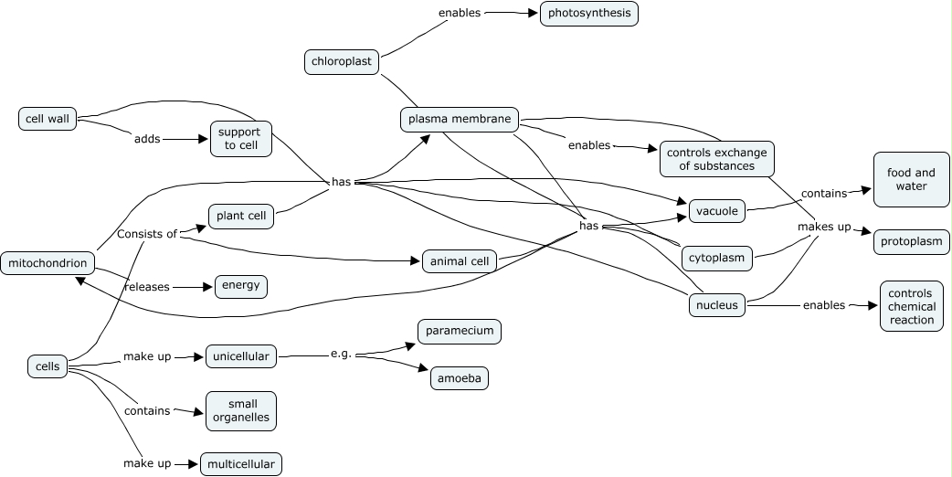 This Concept Map, created with IHMC CmapTools, has information related to: Jurado, plant cell has nucleus, plasma membrane enables controls exchange of substances, cells make up multicellular, cell wall has plasma membrane, cell wall has vacuole, animal cell has nucleus, plant cell has cytoplasm, animal cell has vacuole, chloroplast enables photosynthesis, plasma membrane has nucleus, plasma membrane makes up protoplasm, cells Consists of plant cell, cytoplasm makes up protoplasm, cell wall has cytoplasm, cell wall has nucleus, plant cell has vacuole, chloroplast has mitochondrion, animal cell has mitochondrion, nucleus makes up protoplasm, unicellular e.g. paramecium