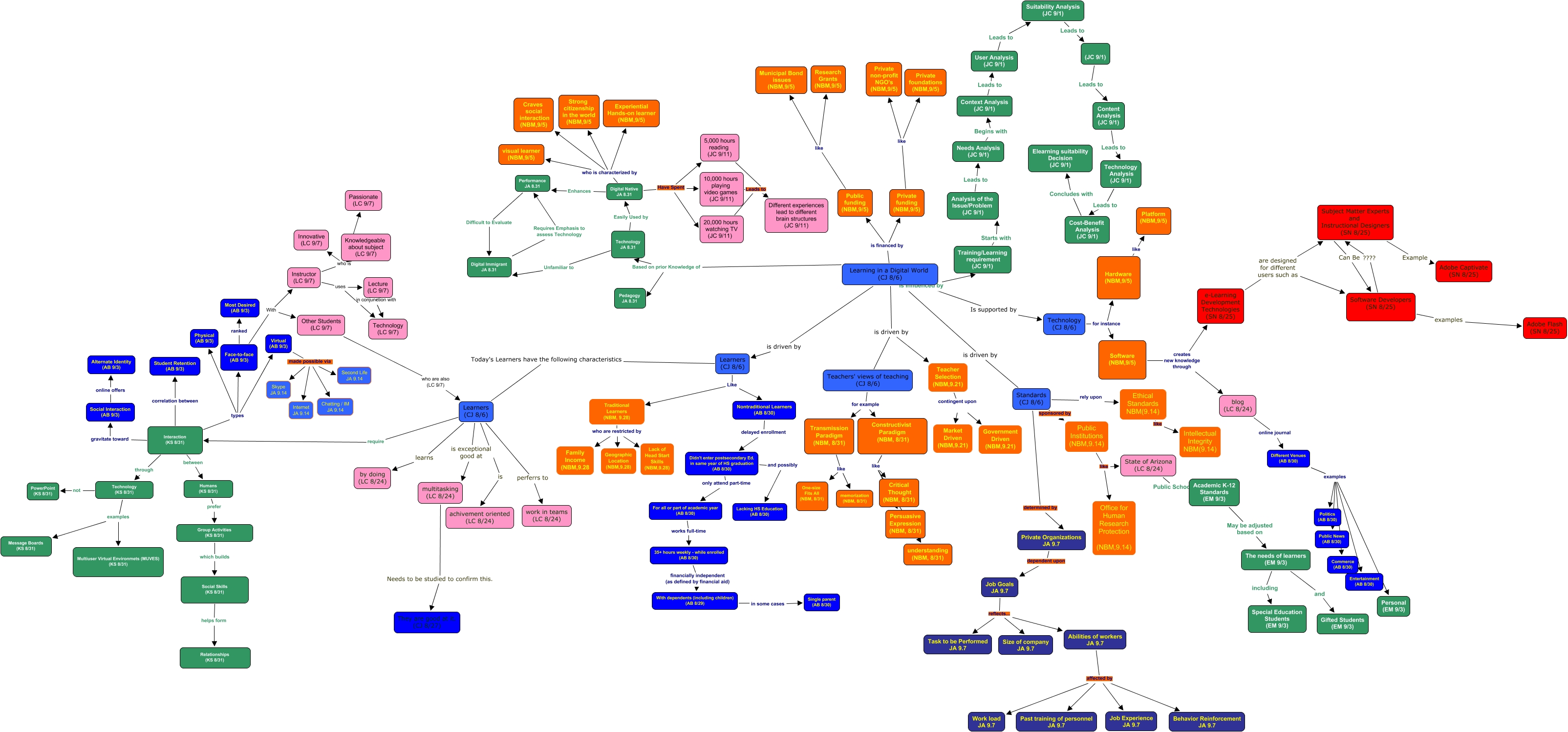 This Concept Map, created with IHMC CmapTools, has information related to: Learning in a Digital World, Learners (CJ 8/6) Like Traditional Learners (NBM, 9.28), Virtual (AB 9/3) made possible via Second Life JA 9.14, Standards (CJ 8/6) determined by Private Organizations JA 9.7, Job Goals JA 9.7 reflects... Task to be Performed JA 9.7, Interaction (KS 8/31) types Physical (AB 9/3), Cost-Benefit Analysis (JC 9/1) Concludes with Elearning suitability Decision (JC 9/1), (JC 9/1) Leads to Content Analysis (JC 9/1), Needs Analysis (JC 9/1) Begins with Context Analysis (JC 9/1), Social Skills (KS 8/31) helps form Relationships (KS 8/31), Technology (KS 8/31) examples Message Boards (KS 8/31), Technology (KS 8/31) not PowerPoint (KS 8/31), Group Activities (KS 8/31) which builds Social Skills (KS 8/31), Learners (CJ 8/6) Today's Learners have the following characteristics Learners (CJ 8/6), Didn't enter postsecondary Ed. in same year of HS graduation (AB 8/30) only attend part-time For all or part of academic year (AB 8/30), Didn't enter postsecondary Ed. in same year of HS graduation (AB 8/30) and possibly Lacking HS Education (AB 8/30), Different Venues (AB 8/30) examples Commerce (AB 8/30), Learning in a Digital World (CJ 8/6) Based on prior Knowledge of Technology JA 8.31, Learning in a Digital World (CJ 8/6) Based on prior Knowledge of Pedagogy JA 8.31, Digital Native JA 8.31 who is characterized by Strong citizenship in the world (NBM,9/5, Private funding (NBM,9/5) like Private foundations (NBM,9/5)