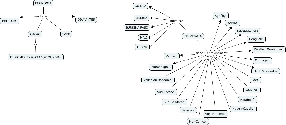 This Concept Map, created with IHMC CmapTools, has information related to: Leo CdI, GEOGRAFIA tiene 19 provincias Vallée du Bandama, GEOGRAFIA limita con BURKINA FASO, GEOGRAFIA tiene 19 provincias Agnéby, GEOGRAFIA tiene 19 provincias Savanes, ECONOMIA tiene PETROLEO, GEOGRAFIA tiene 19 provincias Sud-Bandama, GEOGRAFIA tiene 19 provincias Zanzan, GEOGRAFIA limita con GUINEA, GEOGRAFIA tiene 19 provincias Worodougou, GEOGRAFIA tiene 19 provincias Sud-Comoé, GEOGRAFIA tiene 19 provincias Moyen-Comoé, ECONOMIA tiene DIAMANTES, ECONOMIA tiene CACAO, GEOGRAFIA tiene 19 provincias Lagunes, GEOGRAFIA limita con MALI, GEOGRAFIA tiene 19 provincias Marahoué, GEOGRAFIA tiene 19 provincias Lacs, GEOGRAFIA tiene 19 provincias Fromager, GEOGRAFIA tiene 19 provincias BAFING, GEOGRAFIA tiene 19 provincias Haut-Sassandra