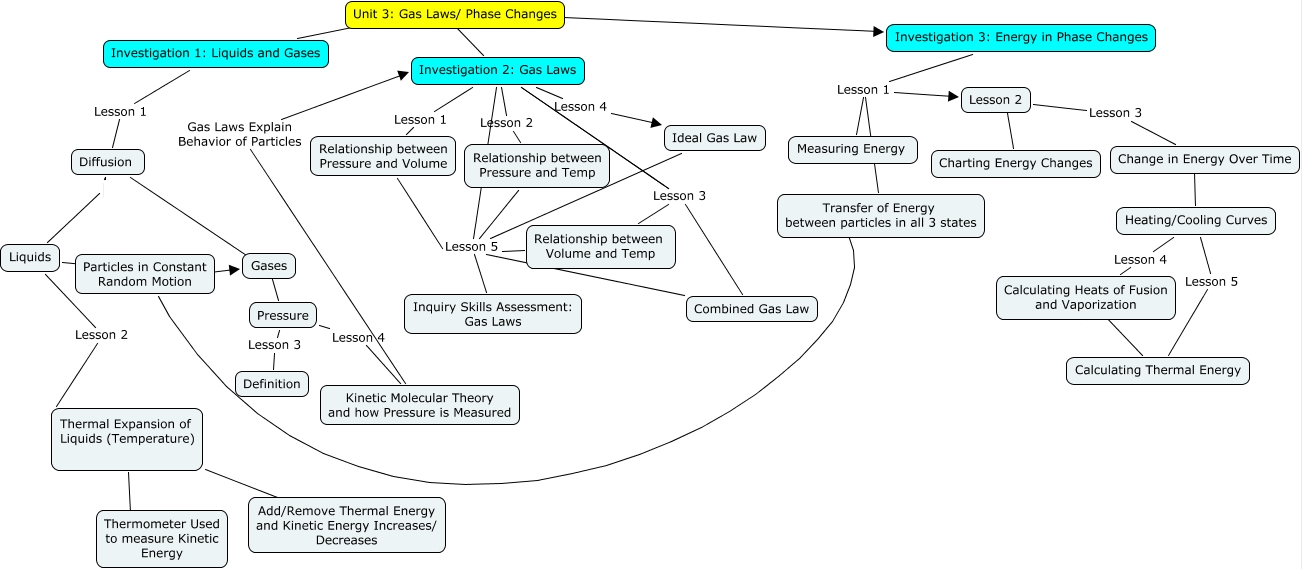 This Concept Map, created with IHMC CmapTools, has information related to: Unit 3 Gas Laws and Phase Changes, Diffusion ???? Gases, Diffusion Liquids, Thermal Expansion of Liquids (Temperature) ???? Thermometer Used to measure Kinetic Energy, Investigation 3: Energy in Phase Changes Lesson 1 Measuring Energy, Relationship between Pressure and Temp Lesson 5 Inquiry Skills Assessment: Gas Laws, Unit 3: Gas Laws/ Phase Changes ???? Investigation 3: Energy in Phase Changes, Relationship between Pressure and Volume Lesson 5 Inquiry Skills Assessment: Gas Laws, Diffusion Liquids, Ideal Gas Law Lesson 5 Inquiry Skills Assessment: Gas Laws, Change in Energy Over Time ???? Heating/Cooling Curves, Heating/Cooling Curves Lesson 5 Calculating Thermal Energy, Particles in Constant Random Motion ???? Gases, Investigation 2: Gas Laws Lesson 3 Combined Gas Law, Investigation 3: Energy in Phase Changes Lesson 1 Lesson 2, Investigation 2: Gas Laws Lesson 5 Inquiry Skills Assessment: Gas Laws, Investigation 2: Gas Laws Lesson 3 Combined Gas Law, Calculating Thermal Energy ???? Calculating Heats of Fusion and Vaporization, Pressure Lesson 3 Definition, Lesson 2 Lesson 3 Change in Energy Over Time, Investigation 1: Liquids and Gases ???? Unit 3: Gas Laws/ Phase Changes
