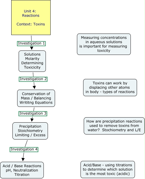 This Concept Map, created with IHMC CmapTools, has information related to: Unit 4 Toxins, Precipitation Stoichiometry Limiting / Excess Investigation 4 Acid / Base Reactions pH, Neutralization Titration, Solutions Molarity Determining Toxicicity Investigation 2 Conservation of Mass / Balancing Writitng Equations, Conservation of Mass / Balancing Writitng Equations Investigation 3 Precipitation Stoichiometry Limiting / Excess, Unit 4: Reactions Context: Toxins Investigation 1 Solutions Molarity Determining Toxicicity