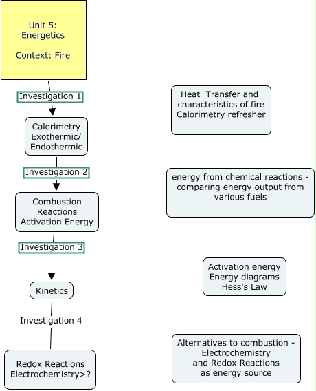 This Concept Map, created with IHMC CmapTools, has information related to: Unit 5 Energy, Kinetics Investigation 4 Redox Reactions Electrochemistry>?, Unit 5: Energetics Context: Fire Investigation 1 Calorimetry Exothermic/ Endothermic, Calorimetry Exothermic/ Endothermic Investigation 2 Combustion Reactions Activation Energy, Combustion Reactions Activation Energy Investigation 3 Kinetics