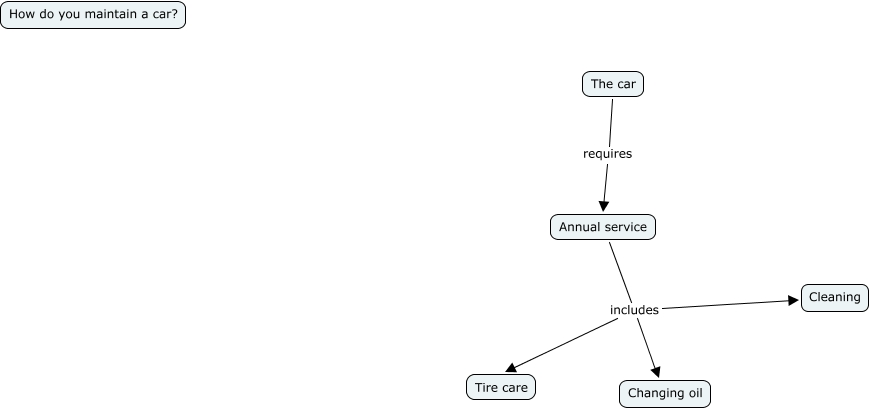 This Concept Map, created with IHMC CmapTools, has information related to: Car maintenance, Annual service includes Cleaning, Annual service includes Tire care, The car requires Annual service, Annual service includes Changing oil