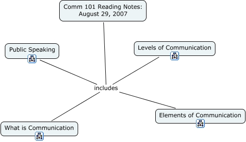 This Concept Map, created with IHMC CmapTools, has information related to: Reading Notes 8-29, Comm 101 Reading Notes: August 29, 2007 includes Levels of Communication, Comm 101 Reading Notes: August 29, 2007 includes Public Speaking, Comm 101 Reading Notes: August 29, 2007 includes What is Communication, Comm 101 Reading Notes: August 29, 2007 includes Elements of Communication