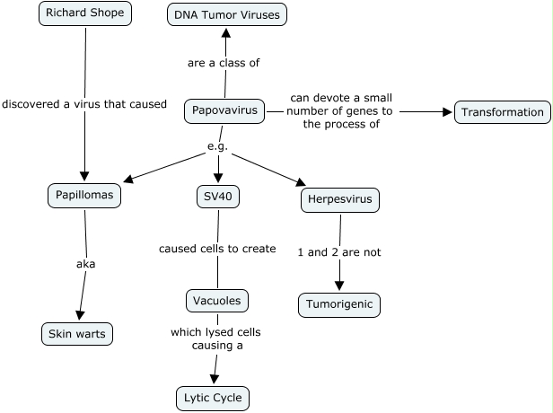 This Concept Map, created with IHMC CmapTools, has information related to: 3.4, Herpesvirus 1 and 2 are not Tumorigenic, Papillomas aka Skin warts, Vacuoles which lysed cells causing a Lytic Cycle, SV40 caused cells to create Vacuoles, Papovavirus can devote a small number of genes to the process of Transformation, Papovavirus e.g. Herpesvirus, Papovavirus e.g. Papillomas, Richard Shope discovered a virus that caused Papillomas, Papovavirus are a class of DNA Tumor Viruses, Papovavirus e.g. SV40