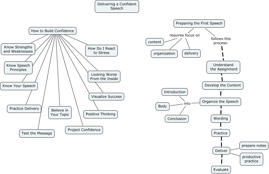 This Concept Map, created with IHMC CmapTools, has information related to: Chapter 3, How to Build Confidence ???? Test the Message, Organize the Speech into Conclusion, Deliver ???? productive practice, Preparing the First Speech follows this process: Understand the Assignment, How to Build Confidence ???? Know Strengths and Weaknesses, Organize the Speech into Body, Wording ???? Practice, How to Build Confidence ???? Know Speech Principles, Preparing the First Speech requires focus on delivery, How to Build Confidence ???? Project Confidence, How to Build Confidence ???? Practice Delivery, How to Build Confidence ???? How Do I React to Stress, How to Build Confidence ???? Know Your Speech, Preparing the First Speech requires focus on content, How to Build Confidence ???? Positive Thinking, How to Build Confidence ???? Looking Worse From the Inside, Organize the Speech ???? Wording, How to Build Confidence ???? Visualize Success, Develop the Content ???? Organize the Speech, Preparing the First Speech requires focus on organization