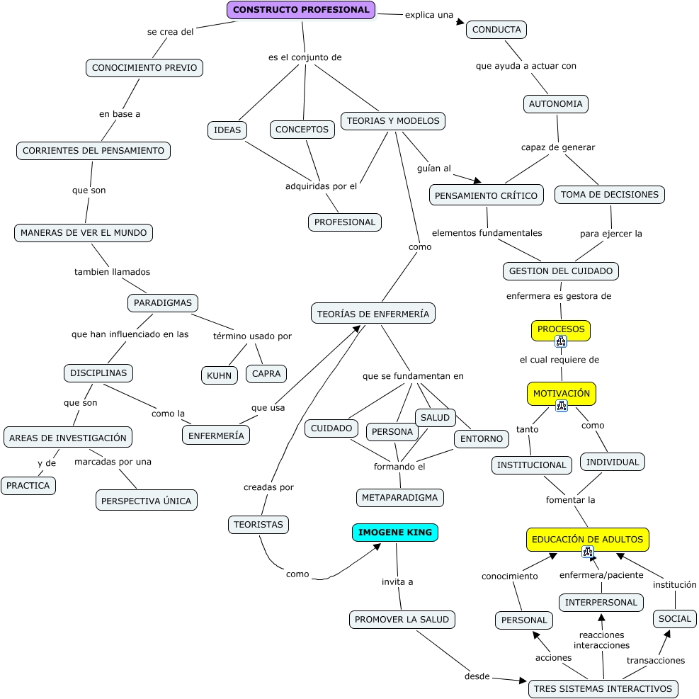 This Concept Map, created with IHMC CmapTools, has information related to: Constructo Profesional, TEORÍAS DE ENFERMERÍA que se fundamentan en CUIDADO, DISCIPLINAS que son AREAS DE INVESTIGACIÓN, SOCIAL institución EDUCACIÓN DE ADULTOS, PROCESOS el cual requiere de MOTIVACIÓN, CONSTRUCTO PROFESIONAL se crea del CONOCIMIENTO PREVIO, CONSTRUCTO PROFESIONAL explica una CONDUCTA, INDIVIDUAL fomentar la EDUCACIÓN DE ADULTOS, MOTIVACIÓN tanto INSTITUCIONAL, MANERAS DE VER EL MUNDO tambien llamados PARADIGMAS, AUTONOMIA capaz de generar TOMA DE DECISIONES, PERSONAL conocimiento EDUCACIÓN DE ADULTOS, DISCIPLINAS como la ENFERMERÍA, CUIDADO formando el METAPARADIGMA, CONSTRUCTO PROFESIONAL es el conjunto de CONCEPTOS, PROMOVER LA SALUD desde TRES SISTEMAS INTERACTIVOS, INSTITUCIONAL fomentar la EDUCACIÓN DE ADULTOS, TEORÍAS DE ENFERMERÍA que se fundamentan en ENTORNO, IMOGENE KING invita a PROMOVER LA SALUD, PARADIGMAS término usado por KUHN, TEORÍAS DE ENFERMERÍA que se fundamentan en PERSONA