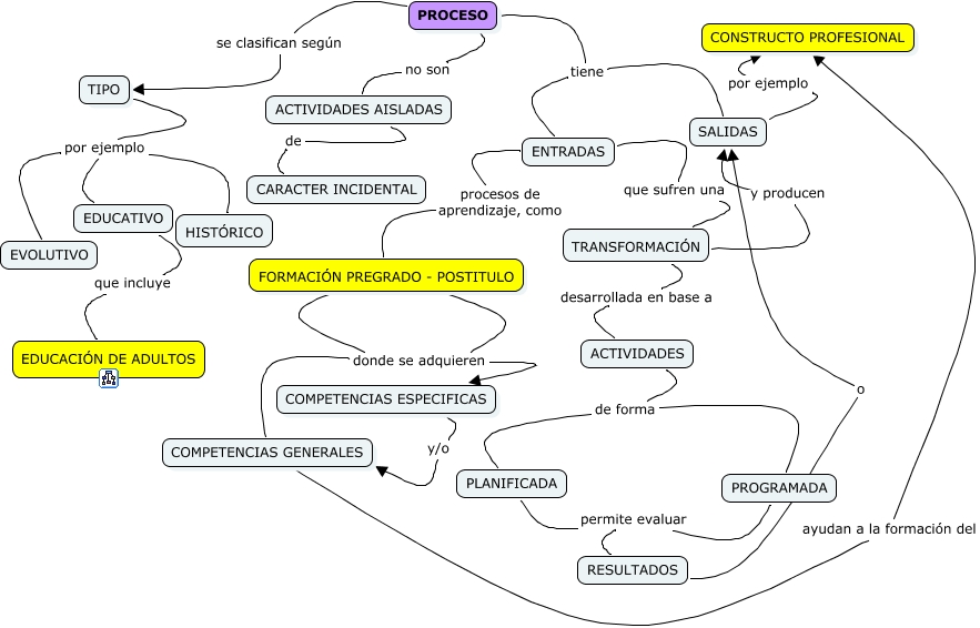 This Concept Map, created with IHMC CmapTools, has information related to: Proceso, PLANIFICADA permite evaluar RESULTADOS, SALIDAS por ejemplo CONSTRUCTO PROFESIONAL, TIPO por ejemplo HISTÓRICO, PROGRAMADA permite evaluar RESULTADOS, RESULTADOS o SALIDAS, FORMACIÓN PREGRADO - POSTITULO adquieren COMPETENCIAS ESPECIFICAS, ENTRADAS procesos de aprendizaje, como FORMACIÓN PREGRADO - POSTITULO, ACTIVIDADES de forma PROGRAMADA, ACTIVIDADES de forma PLANIFICADA, ACTIVIDADES AISLADAS de CARACTER INCIDENTAL, EDUCATIVO que incluye EDUCACIÓN DE ADULTOS, TIPO por ejemplo EVOLUTIVO, FORMACIÓN PREGRADO - POSTITULO donde se COMPETENCIAS GENERALES, TIPO por ejemplo EDUCATIVO, ENTRADAS que sufren una TRANSFORMACIÓN, COMPETENCIAS GENERALES ayudan a la formación del CONSTRUCTO PROFESIONAL, PROCESO tiene SALIDAS, TRANSFORMACIÓN y producen SALIDAS, PROCESO se clasifican según ????, PROCESO tiene ENTRADAS