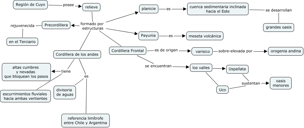 This Concept Map, created with IHMC CmapTools, has information related to: cuyo jenette, relieve formado por estructuras planicie, Payunia es meseta volcánica, los valles Uco, los valles Uspallata, relieve formado por estructuras Payunia, Cordillera Frontal es de origen varisico, Precordillera rejuvenecida en el Terciario, relieve formado por estructuras Cordillera Frontal, Región de Cuyo posee relieve, Cordillera Frontal se encuentran los valles, Uspallata sustentan oasis menores, Cordillera de los andes tiene escurrimientos fluviales hacia ambas vertientes, varisico sobre-elevada por orogenia andina, Cordillera de los andes tiene altas cumbres y nevadas que bloquean los pasos, Uco sustentan oasis menores, relieve formado por estructuras Cordillera de los andes, relieve formado por estructuras Precordillera, Cordillera de los andes es referencia limítrofe entre Chile y Argentina, Cordillera de los andes es divisoria de aguas, cuenca sedimentaria inclinada hacia el Este se desarrollan grandes oasis