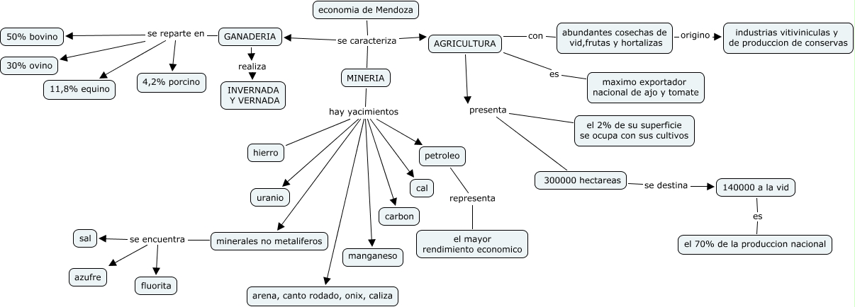 This Concept Map, created with IHMC CmapTools, has information related to: CUYO CHAPU Y OTTO, minerales no metaliferos se encuentra sal, economia de Mendoza se caracteriza GANADERIA, 300000 hectareas se destina 140000 a la vid, MINERIA hay yacimientos hierro, AGRICULTURA presenta 300000 hectareas, GANADERIA se reparte en 11,8% equino, el 2% de su superficie se ocupa con sus cultivos presenta 300000 hectareas, abundantes cosechas de vid,frutas y hortalizas origino industrias vitiviniculas y de produccion de conservas, MINERIA hay yacimientos petroleo, GANADERIA realiza INVERNADA Y VERNADA, petroleo representa el mayor rendimiento economico, economia de Mendoza se caracteriza AGRICULTURA, 140000 a la vid es el 70% de la produccion nacional, MINERIA hay yacimientos carbon, GANADERIA se reparte en 50% bovino, MINERIA hay yacimientos uranio, MINERIA hay yacimientos arena, canto rodado, onix, caliza, MINERIA hay yacimientos manganeso, economia de Mendoza se caracteriza MINERIA, MINERIA hay yacimientos cal
