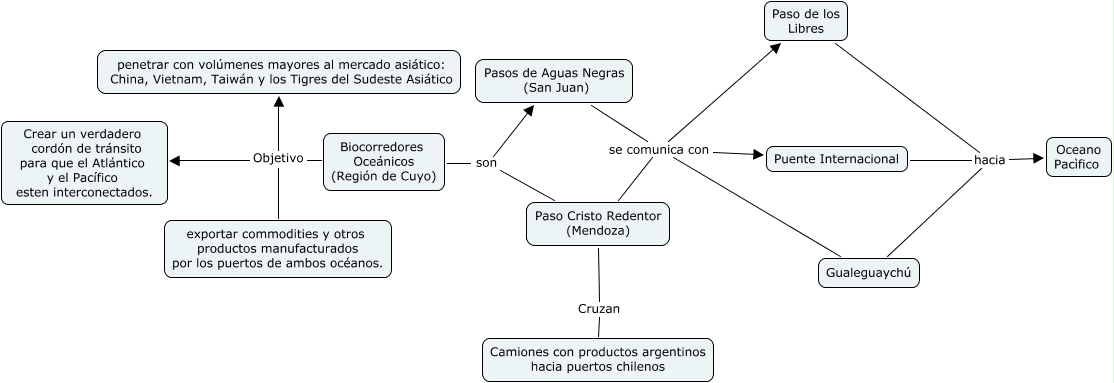 This Concept Map, created with IHMC CmapTools, has information related to: takalulamaybar, Pasos de Aguas Negras (San Juan) se comunica con Gualeguaychú, Paso de los Libres hacia Oceano Pacìfico, Paso Cristo Redentor (Mendoza) se comunica con Gualeguaychú, Puente Internacional hacia Oceano Pacìfico, Biocorredores Oceánicos (Región de Cuyo) Objetivo penetrar con volúmenes mayores al mercado asiático: China, Vietnam, Taiwán y los Tigres del Sudeste Asiático, Paso Cristo Redentor (Mendoza) se comunica con Paso de los Libres, Paso Cristo Redentor (Mendoza) se comunica con Puente Internacional, Biocorredores Oceánicos (Región de Cuyo) son Pasos de Aguas Negras (San Juan), Paso Cristo Redentor (Mendoza) Cruzan Camiones con productos argentinos hacia puertos chilenos, Biocorredores Oceánicos (Región de Cuyo) Objetivo exportar commodities y otros productos manufacturados por los puertos de ambos océanos., Pasos de Aguas Negras (San Juan) se comunica con Puente Internacional, Paso de los Libres hacia Gualeguaychú, Pasos de Aguas Negras (San Juan) se comunica con Paso de los Libres, Biocorredores Oceánicos (Región de Cuyo) son Paso Cristo Redentor (Mendoza), Biocorredores Oceánicos (Región de Cuyo) Objetivo Crear un verdadero cordón de tránsito para que el Atlántico y el Pacífico esten interconectados., Puente Internacional hacia Gualeguaychú