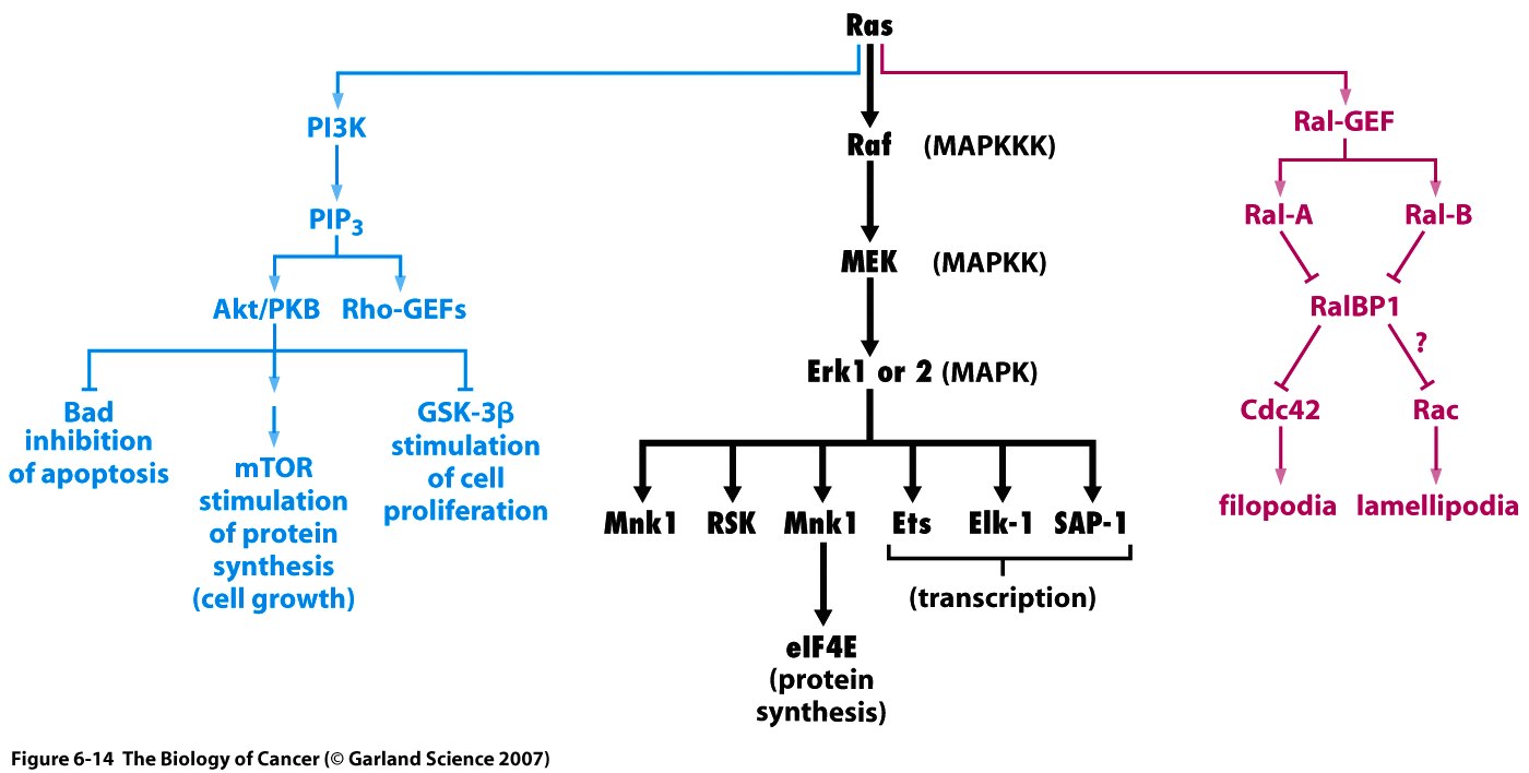 This Concept Map, created with IHMC CmapTools, has information related to: 6-5 Concepts, erk2 phosphorylate ets transcription factor, MEK phosphorylates erk1, growth-regulating genes ex fos, fos described in Chapter 8, raf activates MEK, ets transcription factor stimulates expression of growth-regulating genes, cyclin D1 described in Chapter 8, MEK phosphorylates erk2, ras effectors ex raf, ras protein signals a cascade of kinases, p21^waf1 described in Chapter 8, growth-regulating genes ex p21^waf1, ras effector loop interacts physically with ras effectors, erk1 phosphorylate ets transcription factor, growth-regulating genes ex cyclin D1