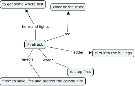 This Concept Map, created with IHMC CmapTools, has information related to: firetruck, Firetruck red color or the truck, Firetruck water to stop fires, Firetruck ladder clim into the builings, Firetruck horn and lights to get some where fast, Firetruck hereo's firemen save lifes and protect the community