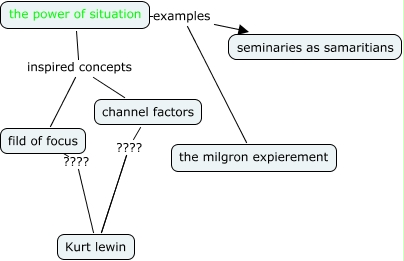This Concept Map, created with IHMC CmapTools, has information related to: situation, fild of focus ???? Kurt lewin, channel factors ???? Kurt lewin, the power of situation inspired concepts channel factors, the power of situation inspired concepts fild of focus, the power of situation examples the milgron expierement, the power of situation examples seminaries as samaritians, channel factors ???? Kurt lewin