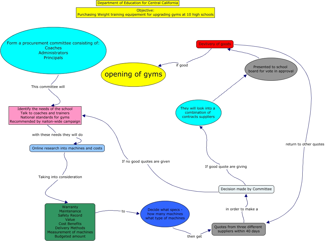 This Concept Map, created with IHMC CmapTools, has information related to: Procurement, Identify the needs of the school Talk to coaches and trainers National standards for gyms Recommended by naiton-wide campaign with these needs they will do Online research into machines and costs, Presented to school board for vote in approval Devlivery of goods, Decision made by Committee If no good quotes are given Identify the needs of the school Talk to coaches and trainers National standards for gyms Recommended by naiton-wide campaign, Decide what specs - how many machines what type of machines then get Quotes from three different suppliers within 40 days, Online research into machines and costs Taking into consideration Warranty Maintenance Safety Record Value Cost Benefits Delivery Methods Measurement of machines Budgeted amount, Devlivery of goods if good opening of gyms, Form a procurement committee consisting of: Coaches Administrators Principals This committee will Identify the needs of the school Talk to coaches and trainers National standards for gyms Recommended by naiton-wide campaign, They will look into a combination of contracts suppliers Presented to school board for vote in approval, Warranty Maintenance Safety Record Value Cost Benefits Delivery Methods Measurement of machines Budgeted amount to Decide what specs - how many machines what type of machines, Quotes from three different suppliers within 40 days in order to make a Decision made by Committee, Devlivery of goods return to other quotes Quotes from three different suppliers within 40 days, Decision made by Committee If good quote are giving They will look into a combination of contracts suppliers