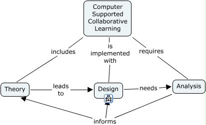 This Concept Map, created with IHMC CmapTools, has information related to: CSCL, Computer Supported Collaborative Learning includes Theory, Design needs Analysis, Computer Supported Collaborative Learning requires Analysis, Analysis informs Design, Computer Supported Collaborative Learning is implemented with Design, Theory leads to Design, Analysis informs Theory