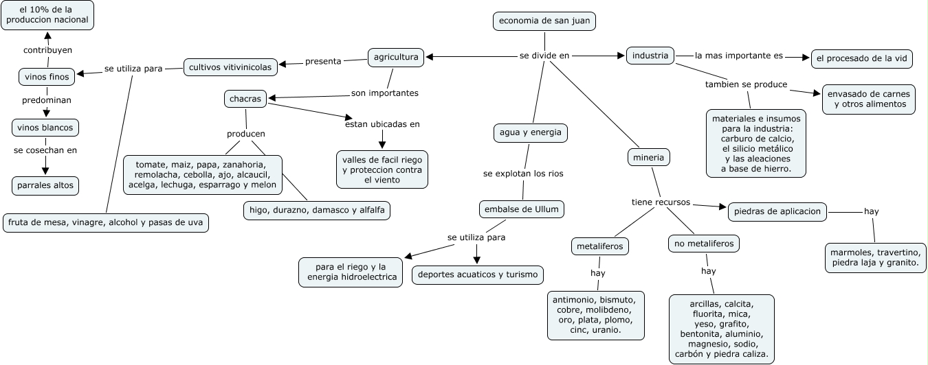 This Concept Map, created with IHMC CmapTools, has information related to: CUYO CHAPU Y OTTO san juan, agua y energia se explotan los rios embalse de Ullum, economia de san juan se divide en industria, industria tambien se produce envasado de carnes y otros alimentos, mineria tiene recursos piedras de aplicacion, agricultura son importantes chacras, vinos finos predominan vinos blancos, economia de san juan se divide en agua y energia, embalse de Ullum se utiliza para deportes acuaticos y turismo, vinos finos contribuyen el 10% de la produccion nacional, vinos blancos se cosechan en parrales altos, piedras de aplicacion hay marmoles, travertino, piedra laja y granito., industria tambien se produce materiales e insumos para la industria: carburo de calcio, el silicio metálico y las aleaciones a base de hierro., embalse de Ullum se utiliza para para el riego y la energia hidroelectrica, cultivos vitivinicolas se utiliza para vinos finos, mineria tiene recursos no metaliferos, metaliferos hay antimonio, bismuto, cobre, molibdeno, oro, plata, plomo, cinc, uranio., cultivos vitivinicolas se utiliza para fruta de mesa, vinagre, alcohol y pasas de uva, mineria tiene recursos metaliferos, industria la mas importante es el procesado de la vid, economia de san juan se divide en mineria