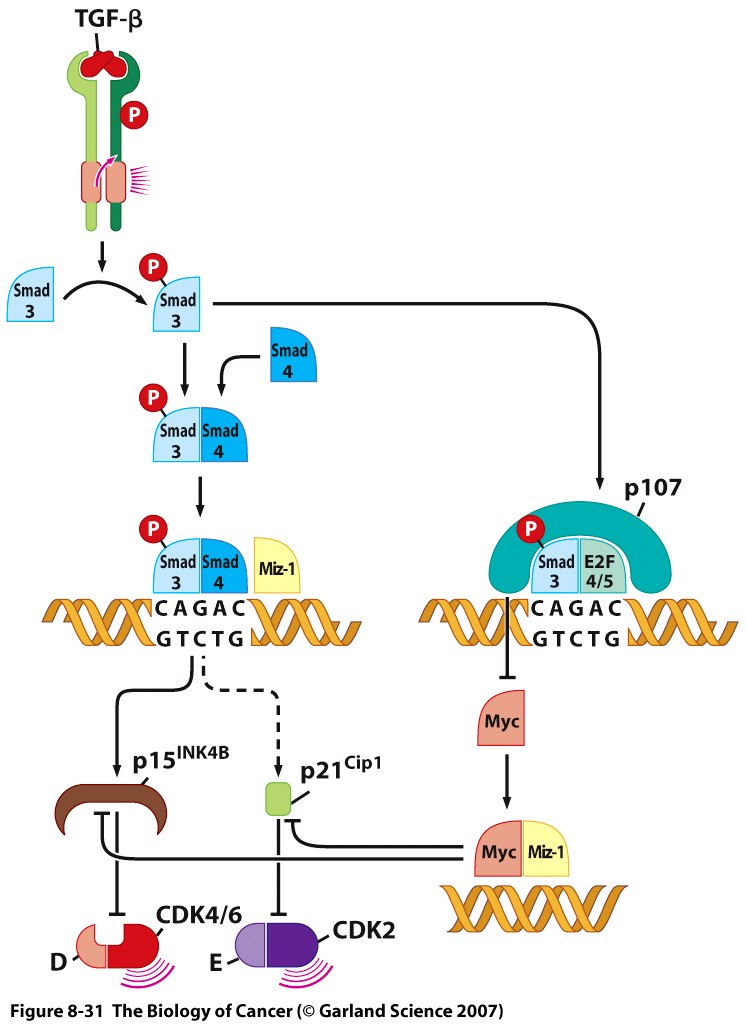 This Concept Map, created with IHMC CmapTools, has information related to: group cmap, E-CDK2 prepares proteins for the centrosome, Smad3-Smad4 comples activates transcription of p15INK45, p15 ink4B inhibits D-CDK4/6, E-CDK2 forms Hyperphosphorylated pRB, hypophosphorylated depending on the phase of the cell cycle, TGF-beta antagonizes tumor progression, pRb gets hyperphosphorylated, cell cycle clock requires regulation of the cell cycle clock, Myc prevents transcription of Miz-1, restriction point aka R point, T oncoprotein have cellular targets, cellular targets are members of pocket proteins, p21Cip1 deactivates A-CDK2, TGF-beta upregulates the transcription of p21Cip1, cell cycle includes mitosis, cyclin E phosphorylates and deactivates p27Kip1, tumor progression ex CML, E-CDK2 hyperphosphorylates pRB, pRb phosphorylation during cell cycle affects actions of pRb, actions of pRb are mostly regulation of the cell cycle clock