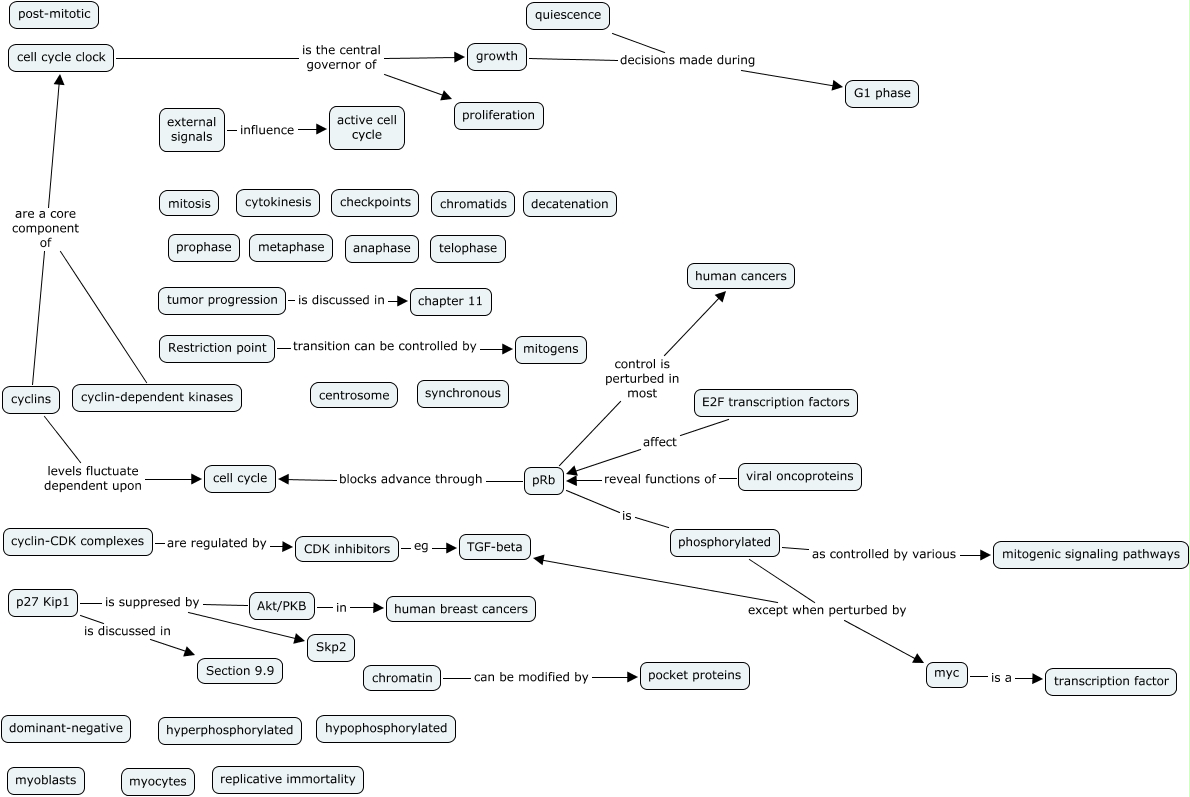This Concept Map, created with IHMC CmapTools, has information related to: Chapter 8 concepts, myc is a transcription factor, cyclins are a core component of cell cycle clock, E2F transcription factors affect pRb, Akt/PKB in human breast cancers, quiescence decisions made during G1 phase, p27 Kip1 is suppresed by Skp2, p27 Kip1 is suppresed by Akt/PKB, tumor progression is discussed in chapter 11, cyclin-dependent kinases are a core component of cell cycle clock, cyclin-CDK complexes are regulated by CDK inhibitors, external signals influence active cell cycle, phosphorylated except when perturbed by myc, phosphorylated as controlled by various mitogenic signaling pathways, Restriction point transition can be controlled by mitogens, cell cycle clock is the central governor of growth, growth decisions made during G1 phase, phosphorylated except when perturbed by TGF-beta, p27 Kip1 is discussed in Section 9.9, CDK inhibitors eg TGF-beta, cell cycle clock is the central governor of proliferation