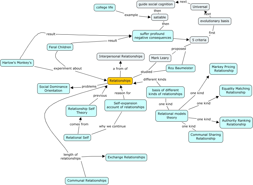 This Concept Map, created with IHMC CmapTools, has information related to: Relationships, Relationships a from of Interpersonal Relationships, basis of different kinds of relationships different kinds Relationships, Relational models theory one kind Communal Sharing Relationship, Relationship Self Theory previous Relationships, Relationships length of relationships Exchange Relationships, Feral Children experiment about Relationships, guide social cognition then satiable, Harlow's Monkey's experiment about Relationships, evolutionary basis next Universal, Relationships problems Social Dominance Orientation, satiable then suffer profound negative consequences, Communal Relationships length of relationships Exchange Relationships, Harlow's Monkey's result suffer profound negative consequences, Relational Self comes from Relationship Self Theory, Self-expansion account of relationships why we continue Relational Self, Relational models theory one kind Markey Pricing Relationship, Roy Baumeister proposed Mark Leary, college life example satiable, Universal next guide social cognition, Self-expansion account of relationships reason for Relationships