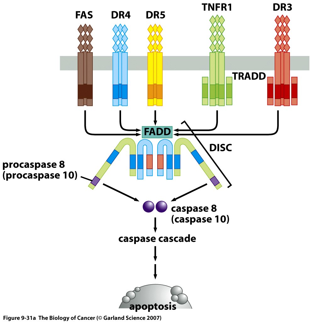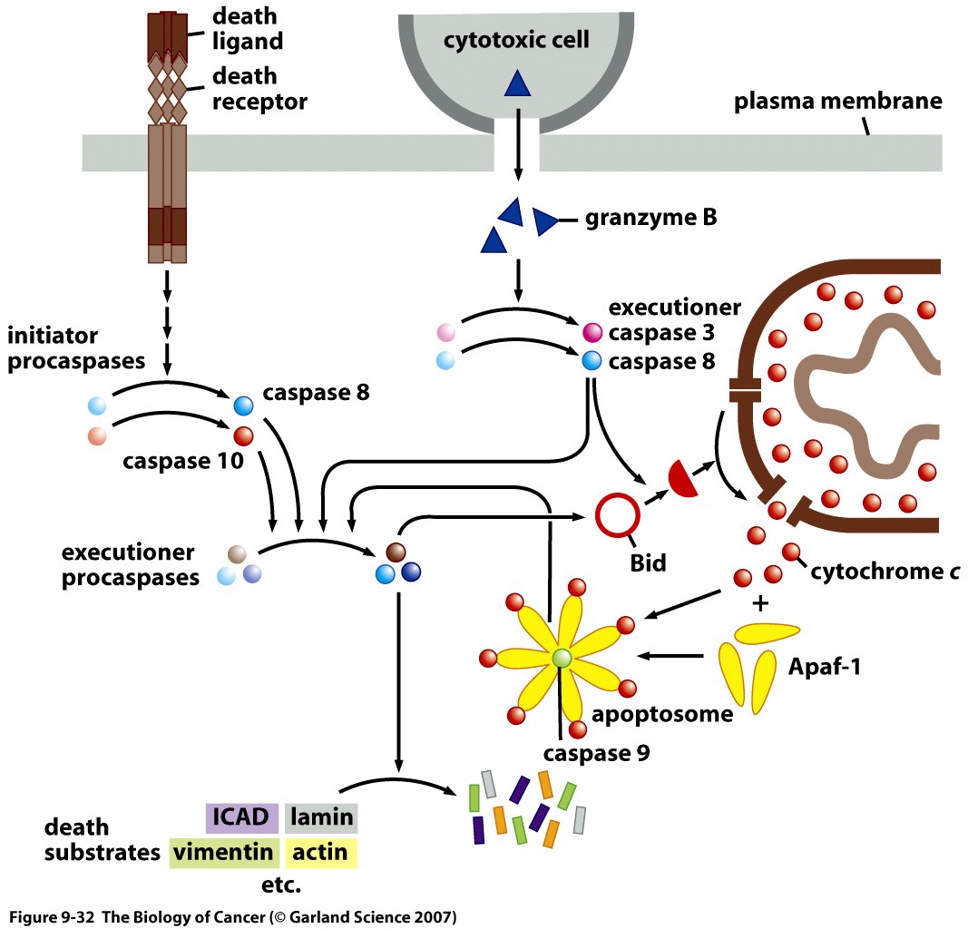 This Concept Map, created with IHMC CmapTools, has information related to: Section 9-14, intrinsic apoptotic shows how p53, p53 evokes apoptosis, intrinsic apoptotic aka stress- activated, intracellular signals activate PI3K-Akt/PKB pathway, extrinsic apoptotic shows how p53, signaling pathways trigger apoptosis, intrinsic apoptotic converge with extrinsic apoptotic, extracellular factors ex autocrine receptor activation, extrinsic apoptotic will be discussed in Chapter 15, extracellular factors favor cell survival, autocrine receptor activation releases intracellular signals, intracellular signals are anti- apoptotic, death receptors activate apoptosis, extrinsic apoptotic aka receptor- activated, DNA tumor viruses inactivate p53