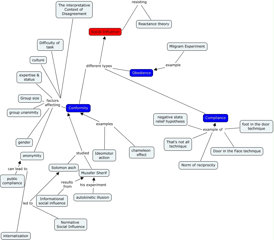 This Concept Map, created with IHMC CmapTools, has information related to: Social Influence, expertise & status factors affecting Conformity, autokinetic illusion his experiment Muzafer Sherif, Door in the Face technique example of Compliance, The interpretative Context of Disagreement factors affecting Conformity, chameleon effect examples Conformity, Norm of reciprocity example of Compliance, Compliance different types Social Influence, gender factors affecting Conformity, Reactance theory resisting Social Influence, Milgram Experiment example Obedience, internalization can lead to anonymity, Group size factors affecting Conformity, foot in the door technique example of Compliance, Solomon asch studied Conformity, negative state relief hypothesis example of Compliance, culture factors affecting Conformity, That's not all technique example of Compliance, Difficulty of task factors affecting Conformity, Muzafer Sherif studied Conformity, Obedience different types Social Influence