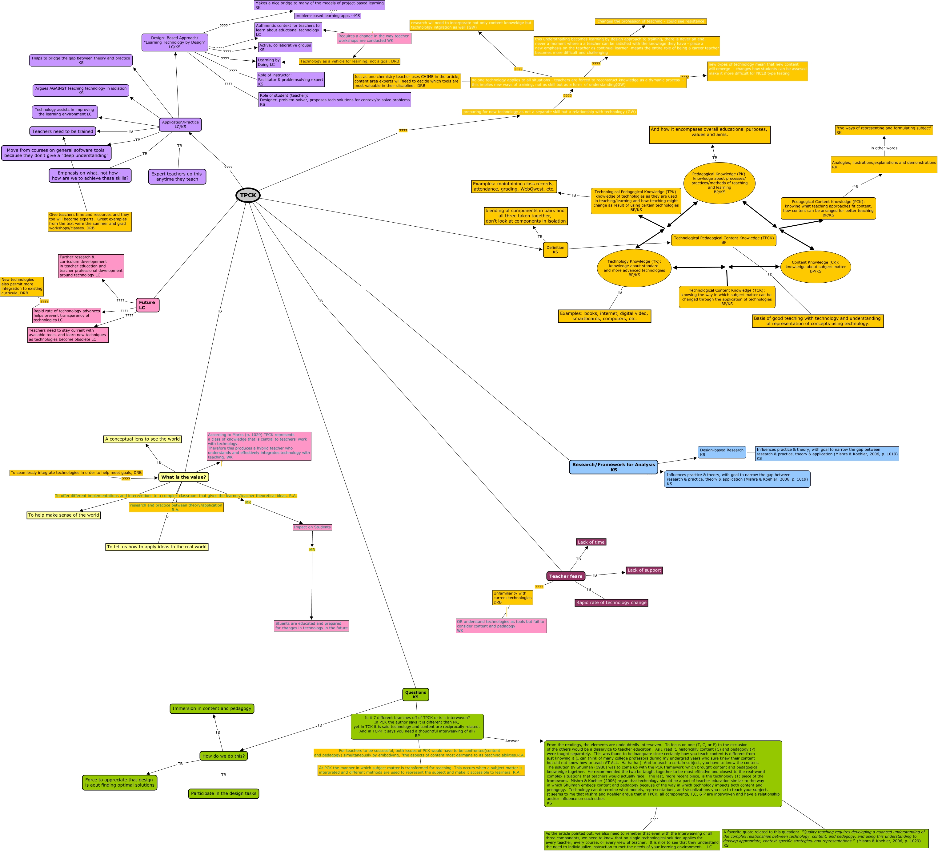 This Concept Map, created with IHMC CmapTools, has information related to: tpck, Application/Practice LC/KS Design- Based Approach/ "Learning Technology by Design" LC/KS, Technological Pedagogical Content Knowledge (TPCK) BP TB Basis of good teaching with technology and understanding of representation of concepts using technology., Application/Practice LC/KS ???? Helps to bridge the gap between theory and practice KS, Impact on Students MR Stuents are educated and prepared for changes in technology in the future, Application/Practice LC/KS ???? Argues AGAINST teaching technology in isolation KS, How do we do this? TB Force to appreciate that design is aout finding optimal solutions, Pedagogical Content Knowledge (PCK): knowing what teaching approaches fit content, how content can be arranged for better teaching BP/KS e.g. Analogies, ilustrations,explanations and demonstrations RK, Technological Pedagogical Knowledge (TPK): knowledge of technologies as they are used in teaching/learning and how teaching might change as result of using certain technologies BP/KS TB Examples: maintaining class records, attendance, grading, WebQwest, etc., Is it 7 different branches off of TPCK or is it interwoven? In PCK the author says it is different than PK, yet in TCK it is said technology and content are reciprocally related. And in TCPK it says you need a thoughtful interweaving of all? BP Answer From the readings, the elements are undoubtedly interwoven. To focus on one (T, C, or P) to the exclusion of the others would be a disservice to teacher education. As I read it, historically content (C) and pedagogy (P) were taught separately. This was found to be inadquate since certainly how you teach content is different from just knowing it (I can think of many college professors during my undergrad years who sure knew their content but did not know how to teach AT ALL. Ha ha ha.) And to teach a certain subject, you have to know the content. The solution by Shulman (1986) was to come up with the PCK framework which brought content and pedagogical knowledge together. He recommended the two be taught together to be most effective and closest to the real-world complex situations that teachers would actually face. The last, more recent piece, is the technology (T) piece of the framework. Mishra & Koehler (2006) argue that technology should be a part of teacher education similar to the way in which Shulman embeds content and pedagogy because of the way in which technology impacts both content and pedagogy. Technology can determine what models, representations, and visualizations you use to teach your subject. It seems to me that Mishra and Koehler argue that in TPCK, all components, T,C, & P are interwoven and have a relationship and/or influence on each other. KS, Is it 7 different branches off of TPCK or is it interwoven? In PCK the author says it is different than PK, yet in TCK it is said technology and content are reciprocally related. And in TCPK it says you need a thoughtful interweaving of all? BP For teachers to be successful, both issues of PCK would have to be confronted(content and pedagogy) simultaneously by embodying, "the aspects of content most germane to its teaching abilities.R.A. At PCK the manner in which subject matter is transformed for teaching. This occurs when a subject matter is interpreted and different methods are used to represent the subject and make it accessible to learners. R.A., Requires a change in the way teacher workshops are conducted WK Authnentic context for teachers to learn about eductional technology LC, New technologies also permit more integration to existing curricula, DRB ???? Rapid rate of techonology advances helps prevent transparancy of technologies LC, Application/Practice LC/KS TB Expert teachers do this anytime they teach, Technology Knowledge (TK): knowledge about standard and more advanced technologies BP/KS Content Knowledge (CK): knowledge about subject matter BP/KS, Research/Framework for Analysis KS ???? Design-based Research KS, TPCK ???? preparing for new technology as not a separate skill but a relationship with technology (GW), Pedagogical Knowledge (PK): knowledge about processes/ practices/methods of teaching and learning BP/KS Technological Pedagogical Knowledge (TPK): knowledge of technologies as they are used in teaching/learning and how teaching might change as result of using certain technologies BP/KS, Technology Knowledge (TK): knowledge about standard and more advanced technologies BP/KS TB Examples: books, internet, digital video, smartboards, computers, etc., Pedagogical Knowledge (PK): knowledge about processes/ practices/methods of teaching and learning BP/KS Technology Knowledge (TK): knowledge about standard and more advanced technologies BP/KS, TPCK Definition KS