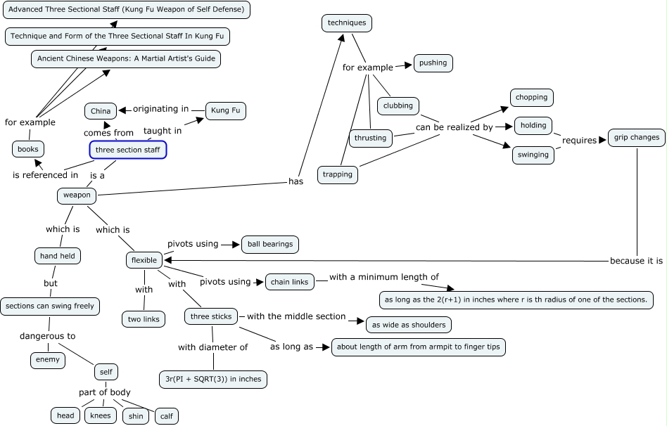 This Concept Map, created with IHMC CmapTools, has information related to: Three section staff, techniques for example pushing, self part of body shin, three sticks with the middle section as wide as shoulders, sections can swing freely dangerous to enemy, sections can swing freely dangerous to self, techniques for example trapping, clubbing can be realized by swinging, flexible with three sticks, books for example Advanced Three Sectional Staff (Kung Fu Weapon of Self Defense), trapping can be realized by chopping, clubbing can be realized by holding, thrusting can be realized by holding, flexible pivots using chain links, hand held but sections can swing freely, weapon which is flexible, weapon has techniques, swinging requires grip changes, techniques for example clubbing, three section staff comes from China, holding requires grip changes