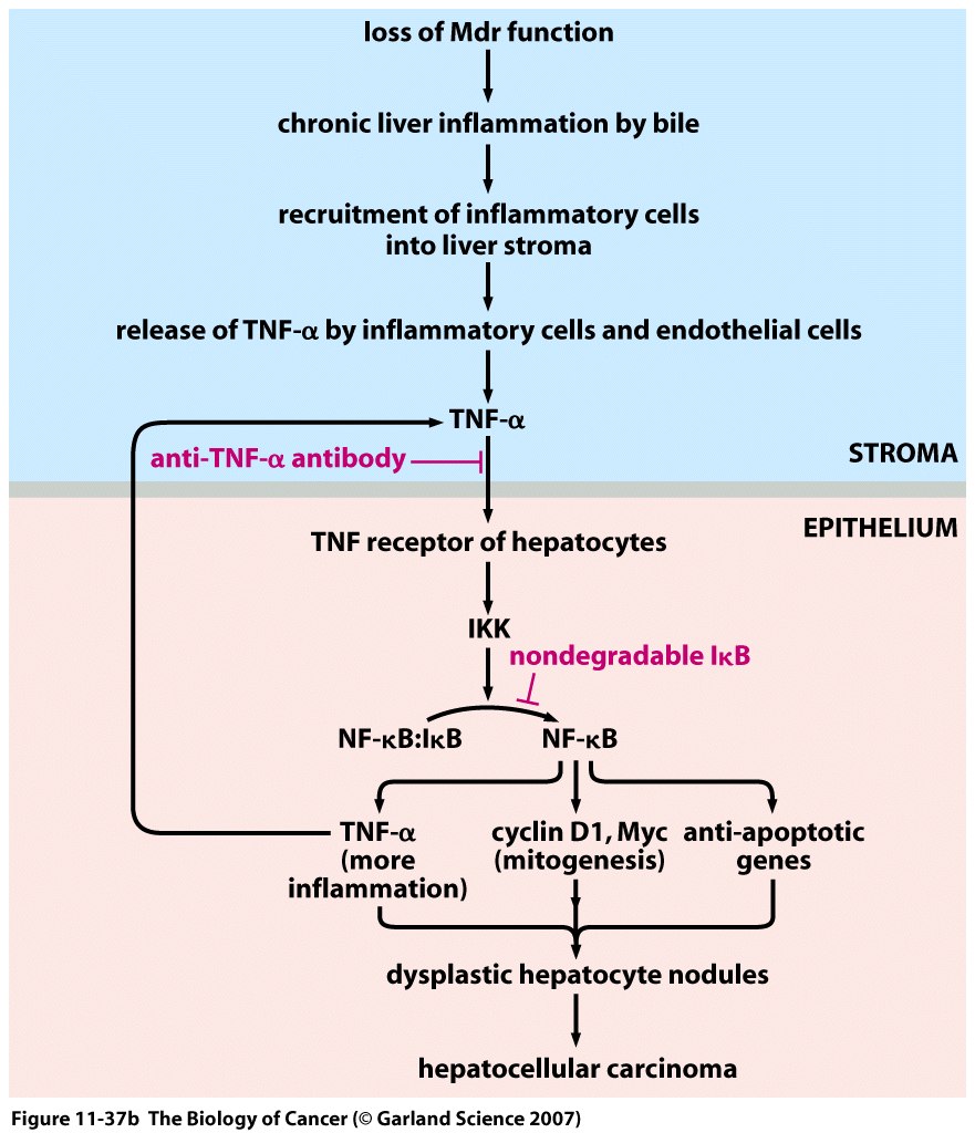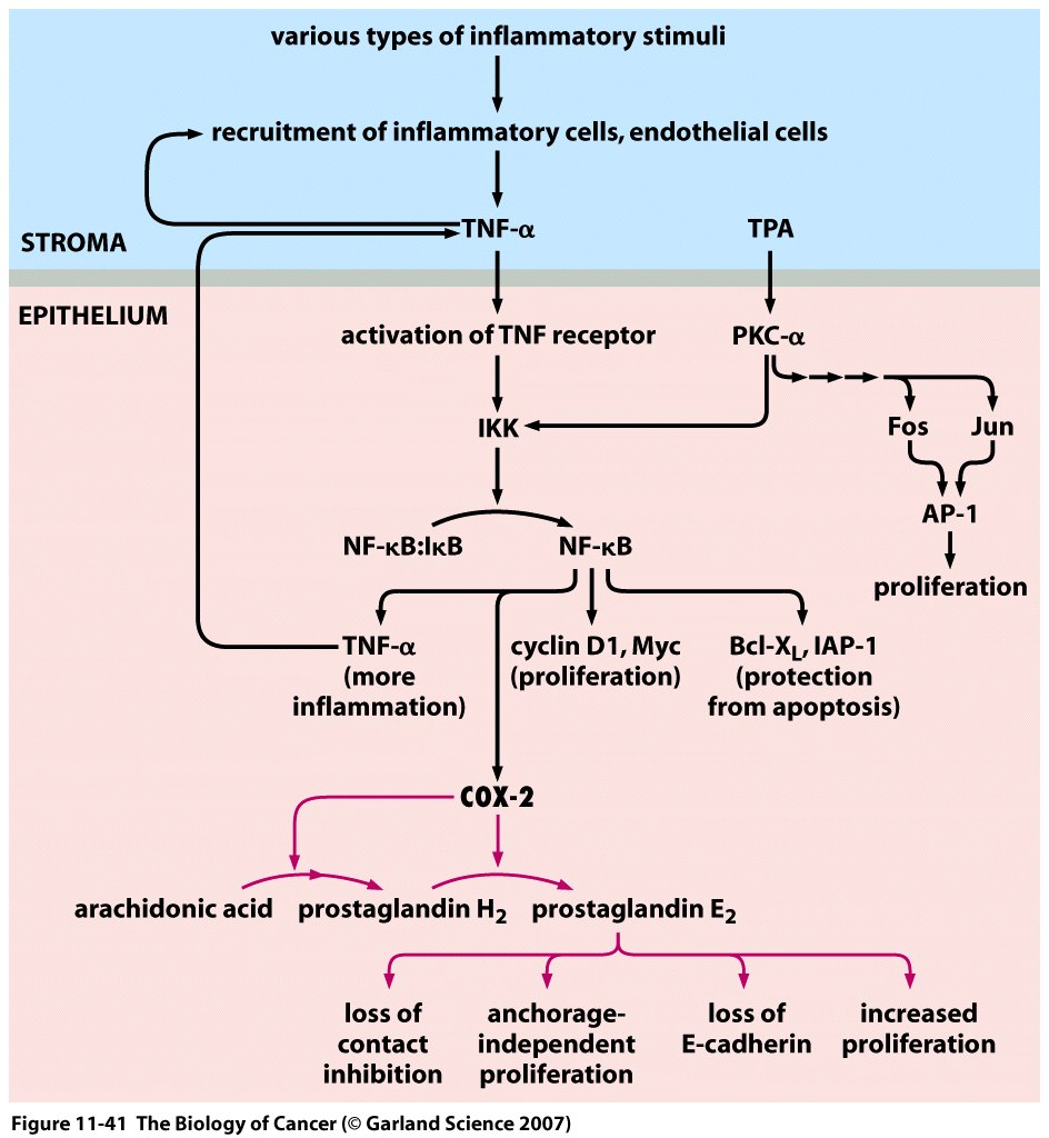 This Concept Map has information related to: Chapter Map, estrogen upreglates growth of mammary epithelial cells, nonmutagenic agents contribute to tumorigenesis, evidence reveal that normal cells, transformation requires 5 intracellular pathways, NF-kapaB pathway activates COX-2, validating Darwinian model of tumor development could be possible through identifying necessary epigenetic events, toxic agents ex distilled alcoholic drinks, initiators alter DNA, PKC-alpha indirectly leads to inflammation, intestinal epithelial tumors can be easily examined for through colonoscopy