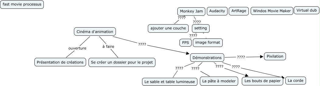 This Concept Map, created with IHMC CmapTools, has information related to: outaouais, Cinéma d'animation ouverture Présentation de créations, Démonstrations ???? La corde, Démonstrations ???? Le sable et table lumineuse, Démonstrations ???? Pixilation, Cinéma d'animation ???? Démonstrations, setting image format, Monkey Jam ???? setting, Cinéma d'animation à faire Se créer un dossier pour le projet, setting ???? FPS, Démonstrations ???? Les bouts de papier, Monkey Jam ???? ajouter une couche, Démonstrations ???? La pâte à modeler