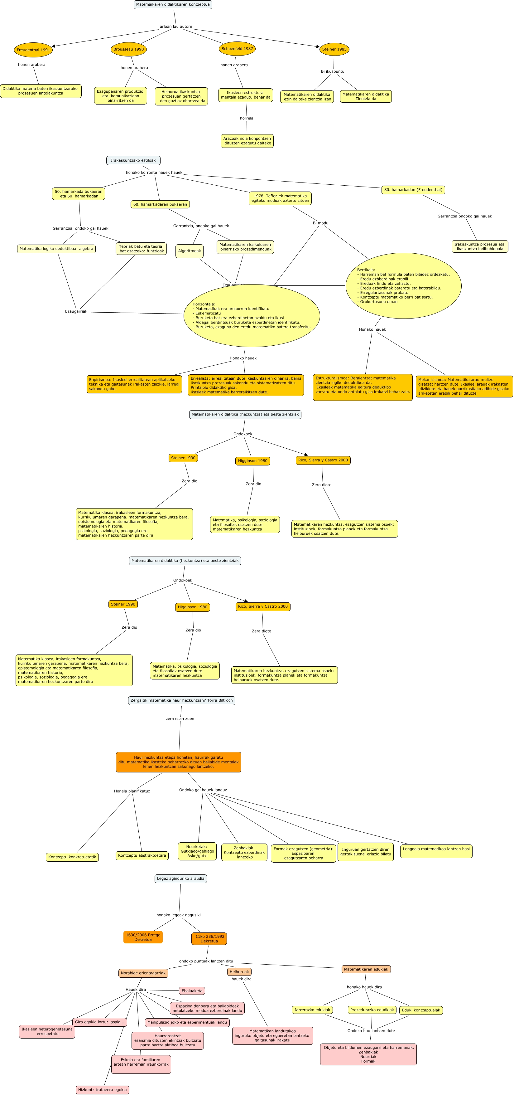 This Concept Map, created with IHMC CmapTools, has information related to: 2_mapa_zarandona_arteaga, Rico, Sierra y Castro 2000 Zera diote Matematikaren hezkuntza, ezagutzen sistema osoek: instituzioek, formakuntza planek eta formakuntza helburuek osatzen dute., 60. hamarkadaren bukaeran Garrantzia, ondoko gai hauek Algoritmoak, Irakaskuntzako estiloak honako korronte hauek hauek 1978. Teffer-ek matematika egiteko moduak aztertu zituen, 1978. Teffer-ek matematika egiteko moduak aztertu zituen Bi modu Horizontala: - Matematikak era orokorren identifikatu - Eskematizatu - Buruketa bat era ezberdinetan azaldu eta ikusi - Aldagai berdintsuak buruketa ezberdinetan identifikatu. - Buruketa, ezaguna den eredu matematiko batera transferitu., Freudenthal 1991 honen arabera Didaktika materia baten ikaskuntzarako prozesuen antolakuntza, Haur hezkuntza etapa honetan, haurrak garatu ditu matematika ikasteko beharrezko dituen baliabide mentalak lehen hezkuntzan sakonago lantzeko. Ondoko gai hauek landuz Zenbakiak: Kontzeptu ezberdinak lantzeko, Matematika logiko deduktiboa: algebra Ezaugarriak Horizontala: - Matematikak era orokorren identifikatu - Eskematizatu - Buruketa bat era ezberdinetan azaldu eta ikusi - Aldagai berdintsuak buruketa ezberdinetan identifikatu. - Buruketa, ezaguna den eredu matematiko batera transferitu., Norabide orientagarriak Hauek dira Eskola eta familiaren artean harreman iraunkorrak, Norabide orientagarriak Hauek dira Giro egokia lortu: lasaia..., Steiner 1990 Zera dio Matematika klasea, irakasleen formakuntza, kurrikulumaren garapena. matematikaren hezkuntza bera, epistemologia eta matematikaren filosofia, matematikaren historia, psikologia, soziologia, pedagogia ere matematikaren hezkuntzaren parte dira, 60. hamarkadaren bukaeran Garrantzia, ondoko gai hauek Matematikaren kalkuloaren oinarrizko prozedimenduak, Teoriak batu eta teoria bat osatzeko: funtzioak Ezaugarriak Horizontala: - Matematikak era orokorren identifikatu - Eskematizatu - Buruketa bat era ezberdinetan azaldu eta ikusi - Aldagai berdintsuak buruketa ezberdinetan identifikatu. - Buruketa, ezaguna den eredu matematiko batera transferitu., Brousseau 1998 honen arabera Ezagupenaren produkzio eta komunikazioan oinarritzen da, Norabide orientagarriak Hauek dira Ikasleen heterogenetasuna errespetatu, Norabide orientagarriak Hauek dira Hizkuntz trataeera egokia, Haur hezkuntza etapa honetan, haurrak garatu ditu matematika ikasteko beharrezko dituen baliabide mentalak lehen hezkuntzan sakonago lantzeko. Honela planifikatuz Kontzeptu abstraktoetara, Steiner 1985 Bi ikuspuntu Matematikaren didaktika Zientzia da, Matematikaren didaktika (hezkuntza) eta beste zientziak Ondokoek Rico, Sierra y Castro 2000, Higginson 1980 Zera dio Matematika, psikologia, soziologia eta filosofiak osatzen dute matematikaren hezkuntza, Matemaikaren didaktikaren kontzeptua arloan lau autore Steiner 1985