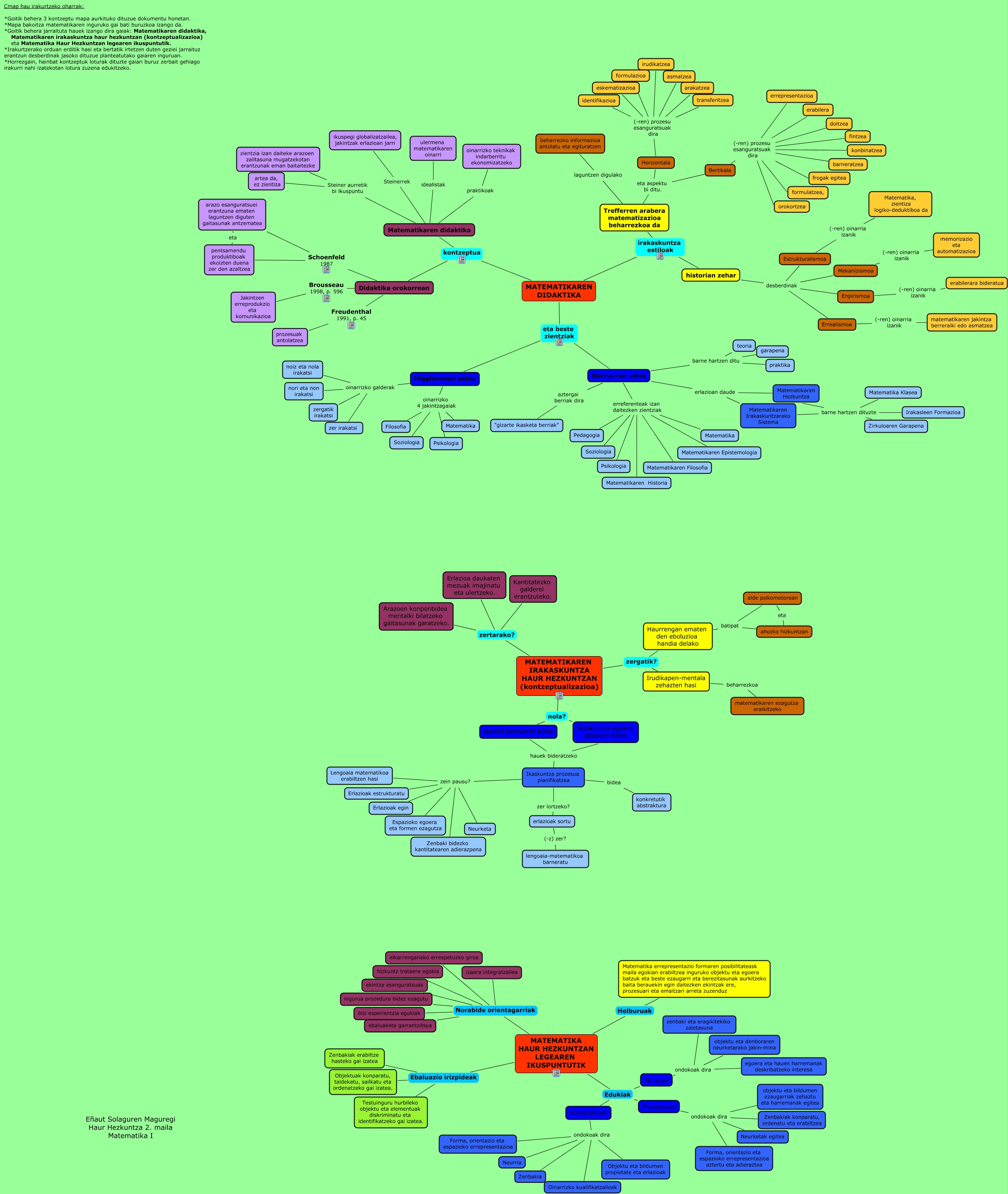 This Concept Map, created with IHMC CmapTools, has information related to: 2_mapa_solaguren_maguregi, Matematikaren Irakaskuntzarako Sistema barne hartzen dituzte Matematika Klasea, Steinerren ustez erlazioan daude Matematikaren Irakaskuntzarako Sistema, Steinerren ustez barne hartzen ditu teoria, historian zehar desberdinak Estrukturalismoa, Bertikala (-ren) prozesu esanguratsuak dira errepresentazioa, Horizontala (-ren) prozesu esanguratsuak dira asmatzea, Horizontala (-ren) prozesu esanguratsuak dira eskematizazioa, Horizontala (-ren) prozesu esanguratsuak dira identifikazioa, Matematikaren didaktika Steinerrek ikuspegi globalizatzailea, jakintzak erlazioan jarri, pentsamendu produktiboak ekoizten duena zer den azaltzea eta arazo esanguratsuei erantzuna ematen laguntzen diguten gaitasunak antzematea, MATEMATIKAREN DIDAKTIKA irakaskuntza estiloak Trefferren arabera matematizazioa beharrezkoa da, alde psikomotorean eta ahozko hizkuntzan, MATEMATIKA HAUR HEZKUNTZAN LEGEAREN IKUSPUNTUTIK Helburuak Matematika errepresentazio formaren posibilitateask maila egokian erabiltzea inguruko objektu eta egoera batzuk eta beste ezaugarri eta berezitasunak aurkitzeko baita berauekin egin daitezken ekintzak ere, prozesuari eta emaitzari arreta zuzenduz, MATEMATIKA HAUR HEZKUNTZAN LEGEAREN IKUSPUNTUTIK Norabide orientagarriak elkarrenganako errespetuzko giroa, MATEMATIKA HAUR HEZKUNTZAN LEGEAREN IKUSPUNTUTIK Ebaluazio irizpideak Zenbakiak erabiltze hasteko gai izatea, MATEMATIKAREN IRAKASKUNTZA HAUR HEZKUNTZAN (kontzeptualizazioa) zergatik? Haurrengan ematen den eboluzioa handia delako, Steinerren ustez erreferenteak izan daitezken zientziak Matematikaren Epistemologia, Errealismoa (-ren) oinarria izanik matematikaren jakintza berreraiki edo asmatzea, Ikaskuntza prozesua planifikatzea zein pausu? Erlazioak estrukturatu, MATEMATIKA HAUR HEZKUNTZAN LEGEAREN IKUSPUNTUTIK Norabide orientagarriak hizkuntz trataera egokia