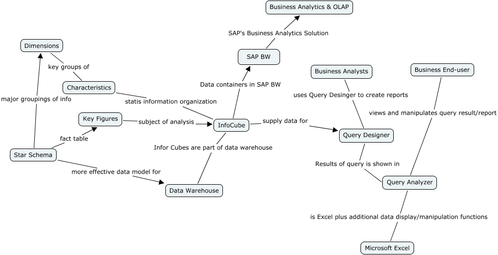This Concept Map, created with IHMC CmapTools, has information related to: OLAP, InfoCube Data containers in SAP BW SAP BW, Query Analyzer is Excel plus additional data display/manipulation functions Microsoft Excel, Star Schema fact table Key Figures, Star Schema more effective data model for Data Warehouse, Business Analysts uses Query Desinger to create reports Query Designer, Characteristics statis information organization InfoCube, SAP BW SAP's Business Analytics Solution Business Analytics & OLAP, InfoCube supply data for Query Designer, InfoCube Infor Cubes are part of data warehouse Data Warehouse, Star Schema major groupings of info Dimensions, Dimensions key groups of Characteristics, Business End-user views and manipulates query result/report Query Analyzer, Query Designer Results of query is shown in Query Analyzer, Key Figures subject of analysis InfoCube