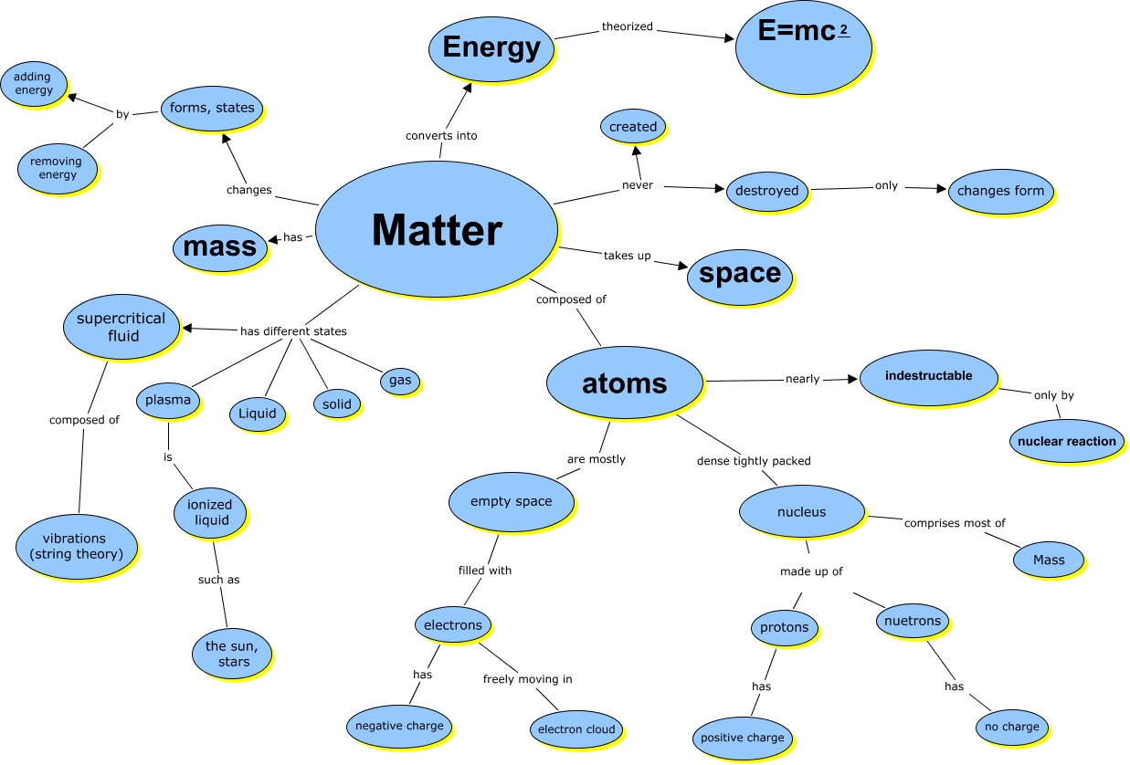 This Concept Map, created with IHMC CmapTools, has information related to: Lissa Linda m, atoms nearly indestructable, Matter converts into Energy, forms, states by adding energy, Matter has different states plasma, nucleus comprises most of Mass, Matter takes up space, Matter has different states Liquid, Matter has different states supercritical fluid, Matter has different states gas, atoms are mostly empty space, forms, states by removing energy, supercritical fluid composed of vibrations (string theory), Matter composed of atoms, Matter never destroyed, indestructable only by nuclear reaction, electrons freely moving in electron cloud, electrons has negative charge, Matter has different states solid, destroyed only changes form, Energy theorized <math xmlns="http://www.w3.org/1998/Math/MathML"> <mrow> <mtext> E=mc </mtext> <mfrac> <mtext> 2 </mtext> <mtext> </mtext> </mfrac> </mrow> </math>
