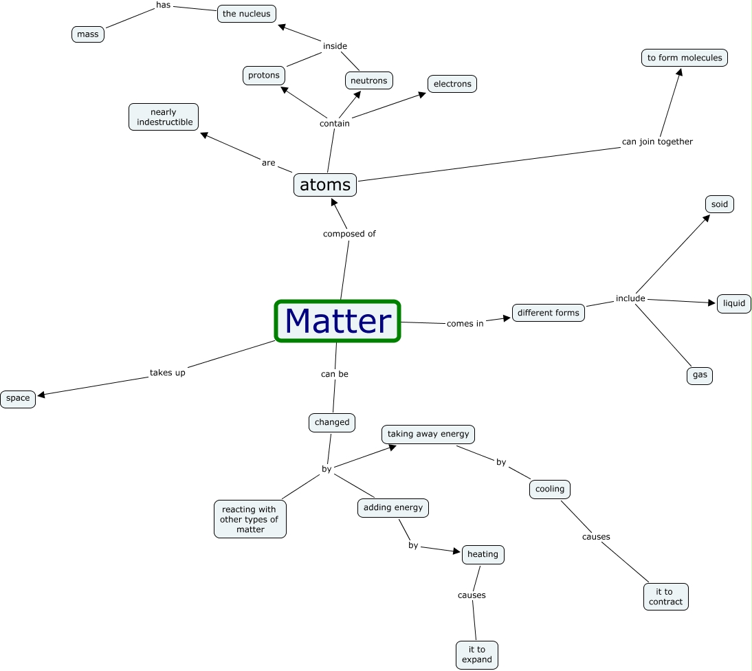 This Concept Map, created with IHMC CmapTools, has information related to: Heidi and Debbie F. M, atoms contain electrons, different forms include liquid, changed by adding energy, atoms are nearly indestructible, Matter composed of atoms, neutrons inside the nucleus, atoms contain neutrons, changed by reacting with other types of matter, protons inside the nucleus, atoms can join together to form molecules, changed by taking away energy, Matter can be changed, adding energy by heating, taking away energy by cooling, Matter takes up space, cooling causes it to contract, Matter comes in different forms, different forms include soid, the nucleus has mass, different forms include gas