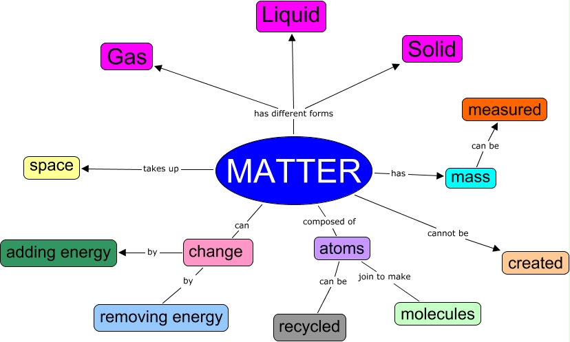 This Concept Map, created with IHMC CmapTools, has information related to: kim gail M, atoms join to make molecules, MATTER has mass, mass can be measured, atoms can be recycled, MATTER has different forms Liquid, MATTER composed of atoms, change by removing energy, MATTER cannot be created, change by adding energy, MATTER has different forms Solid, MATTER takes up space, MATTER has different forms Gas, MATTER can change