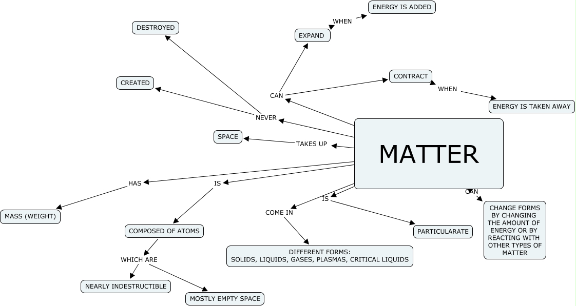 This Concept Map, created with IHMC CmapTools, has information related to: DORIM, MATTER COME IN DIFFERENT FORMS: SOLIDS, LIQUIDS, GASES, PLASMAS, CRITICAL LIQUIDS, MATTER CAN CONTRACT, MATTER CAN EXPAND, MATTER HAS MASS (WEIGHT), CONTRACT WHEN ENERGY IS TAKEN AWAY, MATTER NEVER DESTROYED, MATTER IS PARTICULARATE, COMPOSED OF ATOMS WHICH ARE MOSTLY EMPTY SPACE, MATTER CAN CHANGE FORMS BY CHANGING THE AMOUNT OF ENERGY OR BY REACTING WITH OTHER TYPES OF MATTER, EXPAND WHEN ENERGY IS ADDED, COMPOSED OF ATOMS WHICH ARE NEARLY INDESTRUCTIBLE, MATTER NEVER CREATED, MATTER TAKES UP SPACE, MATTER IS COMPOSED OF ATOMS