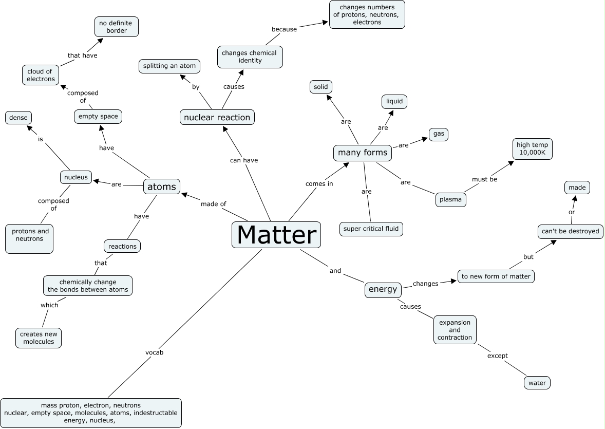 This Concept Map, created with IHMC CmapTools, has information related to: terriraeand chersti- m, many forms are solid, energy changes to new form of matter, cloud of electrons that have no definite border, energy causes expansion and contraction, atoms have empty space, Matter and energy, Matter comes in many forms, atoms have reactions, Matter vocab mass proton, electron, neutrons nuclear, empty space, molecules, atoms, indestructable energy, nucleus,, empty space composed of cloud of electrons, reactions that chemically change the bonds between atoms, nucleus composed of protons and neutrons, atoms are nucleus, plasma must be high temp 10,000K, many forms are liquid, chemically change the bonds between atoms which creates new molecules, to new form of matter but can't be destroyed, many forms are plasma, can't be destroyed or made, nuclear reaction causes changes chemical identity