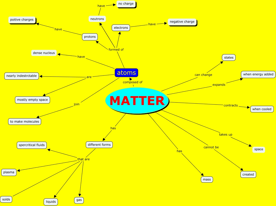 This Concept Map, created with IHMC CmapTools, has information related to: Janis Sondie M, MATTER has different forms, protons have poitive charges, MATTER composed of atoms, atoms formed of electrons, different forms that are solds, atoms formed of neutrons, different forms that are gas, different forms that are spercritical fluids, atoms are nearly indestrctable, neutrons have no charge, atoms are mostly empty space, MATTER cannot be created, MATTER can change states, atoms join to make molecules, different forms that are plasma, different forms that are liquids, atoms have dense nucleus, MATTER has mass, atoms formed of protons, MATTER takes up space