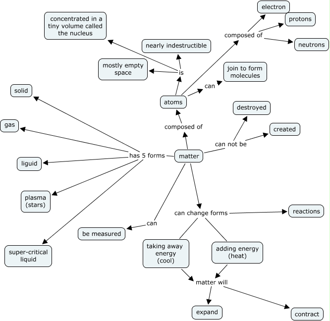 This Concept Map, created with IHMC CmapTools, has information related to: teri and laurie m, taking away energy (cool) matter will expand, atoms is concentrated in a tiny volume called the nucleus, matter has 5 forms super-critical liquid, matter has 5 forms plasma (stars), atoms is mostly empty space, adding energy (heat) can change forms reactions, matter can change forms reactions, adding energy (heat) matter will contract, matter has 5 forms gas, adding energy (heat) can change forms taking away energy (cool), atoms can join to form molecules, matter can not be destroyed, matter has 5 forms solid, adding energy (heat) matter will expand, matter can change forms taking away energy (cool), atoms composed of protons, atoms composed of neutrons, atoms composed of electron, atoms is nearly indestructible, taking away energy (cool) matter will contract