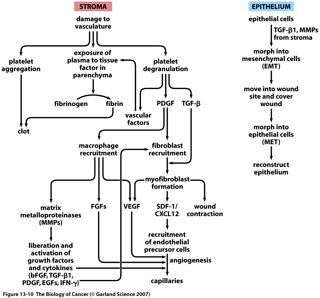 This Concept Map, created with IHMC CmapTools, has information related to: Section 13.3, wounded tissues cause epithelial cells, herceptin reduces relapse of tumors, wound healing attracts mast cells, myofibroblasts are components of tumors, breast cancer surgery stimulates proliferation of micrometastases, fibrocytes can turn to myofibroblasts, angiogenesis aka neoangiogenesis, tissue factor mediates fibrin bundles, tumors resemble wound healing, myofibroblasts assist wound healing, tumor-associated stroma has leaky venules, vasoactive factors initiate formation of the blood clot, eosinophils initiate angiogenesis, desmoplastic stroma instead of normal stroma, epithelial-mesenchymal transition and then MET, serum-activated fibroblasts as determined by functional genomics, fibrocytes can turn to fibroblasts, monocytes initiate angiogenesis, adherens junctions hold together epithelial cells, herceptin blocks HER2/Neu receptor