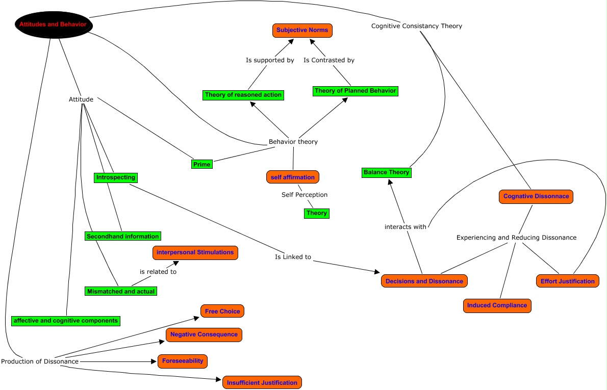 This Concept Map, created with IHMC CmapTools, has information related to: Attitudes and behavior, Attitudes and Behavior Attitude Mismatched and actual, Attitudes and Behavior Behavior theory Theory of Planned Behavior, Theory of Planned Behavior Is Contrasted by Subjective Norms, Attitudes and Behavior Production of Dissonance Negative Consequence, Mismatched and actual is related to interpersonal Stimulations, Effort Justification interacts with Balance Theory, Attitudes and Behavior Attitude affective and cognitive components, Decisions and Dissonance interacts with Balance Theory, Introspecting Is Linked to Decisions and Dissonance, Prime Attitude affective and cognitive components, Cognative Dissonnace Experiencing and Reducing Dissonance Induced Compliance, Prime Behavior theory self affirmation, Cognative Dissonnace Experiencing and Reducing Dissonance Effort Justification, Attitudes and Behavior Cognitive Consistancy Theory Cognative Dissonnace, Attitudes and Behavior Production of Dissonance Insufficient Justification, Attitudes and Behavior Attitude Introspecting, Prime Behavior theory Theory of reasoned action, Cognative Dissonnace Experiencing and Reducing Dissonance Decisions and Dissonance, Prime Attitude Mismatched and actual, Attitudes and Behavior Behavior theory Theory of reasoned action