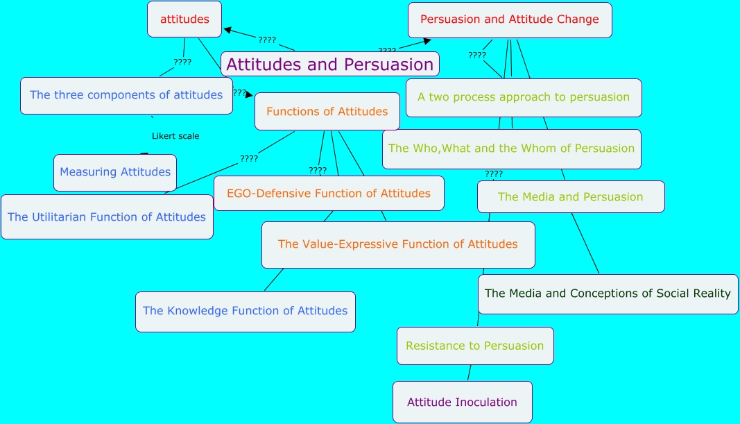 This Concept Map, created with IHMC CmapTools, has information related to: Attitudes and Persuasion, attitudes ???? Functions of Attitudes, Persuasion and Attitude Change ???? Resistance to Persuasion, Functions of Attitudes ???? The Utilitarian Function of Attitudes, Persuasion and Attitude Change The Who,What and the Whom of Persuasion, Resistance to Persuasion ???? Attitude Inoculation, Functions of Attitudes ???? The Value-Expressive Function of Attitudes, Attitudes and Persuasion ???? attitudes, Persuasion and Attitude Change ???? A two process approach to persuasion, attitudes ???? The three components of attitudes, Persuasion and Attitude Change ???? The Media and Persuasion, The three components of attitudes Likert scale Measuring Attitudes, Attitudes and Persuasion ???? Persuasion and Attitude Change, Functions of Attitudes ???? EGO-Defensive Function of Attitudes, The Media and Persuasion ???? The Media and Conceptions of Social Reality, Functions of Attitudes ???? The Knowledge Function of Attitudes