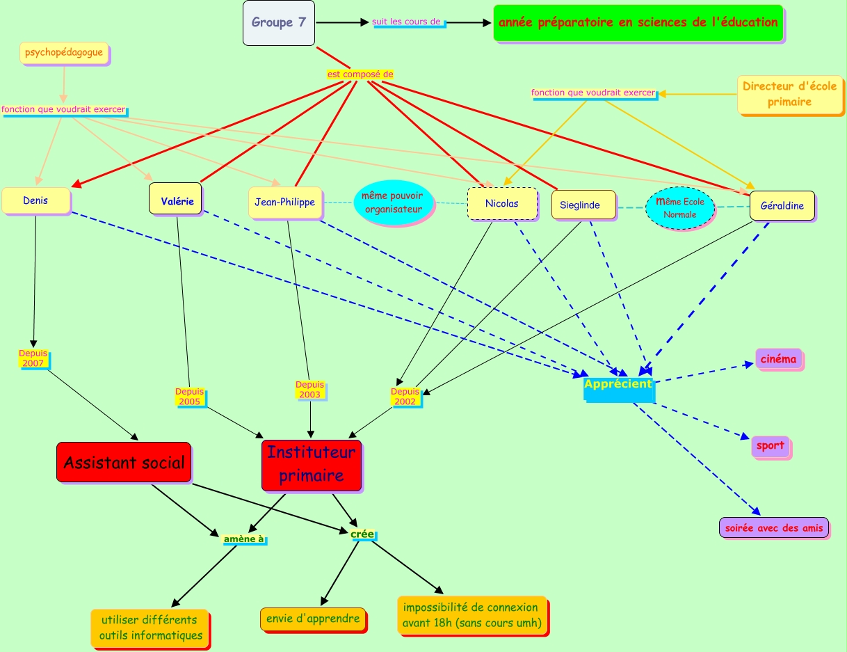 This Concept Map, created with IHMC CmapTools, has information related to: Carte conceptuelle pour l'équipe 7i, Assistant social crée envie d'apprendre, Directeur d'école primaire fonction que voudrait exercer Nicolas, Groupe 7 est composé de Denis, Valérie Apprécient soirée avec des amis, Valérie Depuis 2005 Instituteur primaire, Denis Depuis 2007 Assistant social, Nicolas Apprécient cinéma, même Ecole Normale ???? Géraldine, Sieglinde Apprécient soirée avec des amis, Groupe 7 est composé de Nicolas, Nicolas Apprécient sport, Sieglinde Apprécient sport, Jean-Philippe Apprécient cinéma, Géraldine Apprécient soirée avec des amis, Instituteur primaire amène à utiliser différents outils informatiques, Nicolas Depuis 2002 Instituteur primaire, Sieglinde Apprécient cinéma, psychopédagogue fonction que voudrait exercer Jean-Philippe, Groupe 7 est composé de Géraldine, Denis Apprécient cinéma