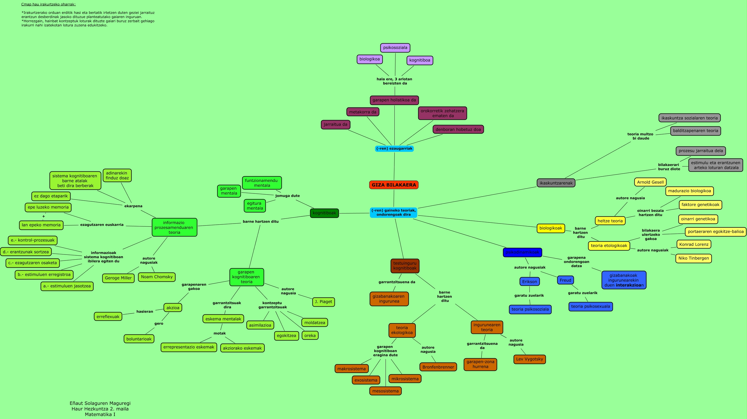 This Concept Map, created with IHMC CmapTools, has information related to: 3_mapa_solaguren_maguregi, GIZA BILAKAERA (-ren) ezaugarriak denboran hobetuz doa, kognitiboak barne hartzen ditu informazio prozesamenduaren teoria, informazio prozesamenduaren teoria ezagutzaren euskarria lan epeko memoria, informazio prozesamenduaren teoria ekarpena adinarekin finduz doaz, teoria ekologikoa garapen kognitiboan eragina dute mikrosistema, heltze teoria oinarri bezala hartzen ditu faktore genetikoak, heltze teoria autore nagusia Arnold Gesell, psikodinamikoak autore nagusiak Erikson, informazio prozesamenduaren teoria autore nagusiak Geroge Miller, ingurunearen teoria autore nagusia Lev Vygotsky, GIZA BILAKAERA (-ren) ezaugarriak jarraitua da, GIZA BILAKAERA (-ren) ezaugarriak metakorra da, GIZA BILAKAERA (-ren) ezaugarriak orokorretik zehatzera ematen da, GIZA BILAKAERA (-ren) gaineko teoriak, ondorengoak dira testuinguru kognitiboak, GIZA BILAKAERA (-ren) gaineko teoriak, ondorengoak dira kognitiboak, heltze teoria oinarri bezala hartzen ditu madurazio biologikoa, teoria etologikoak bilakaera ulertzeko gakoa portaeraren egokitze-balioa, psikodinamikoak autore nagusiak Freud, Freud garatu zuelarik teoria psikosexuala, ikaskuntzarenak teoria multzo bi daude balditzapenaren teoria