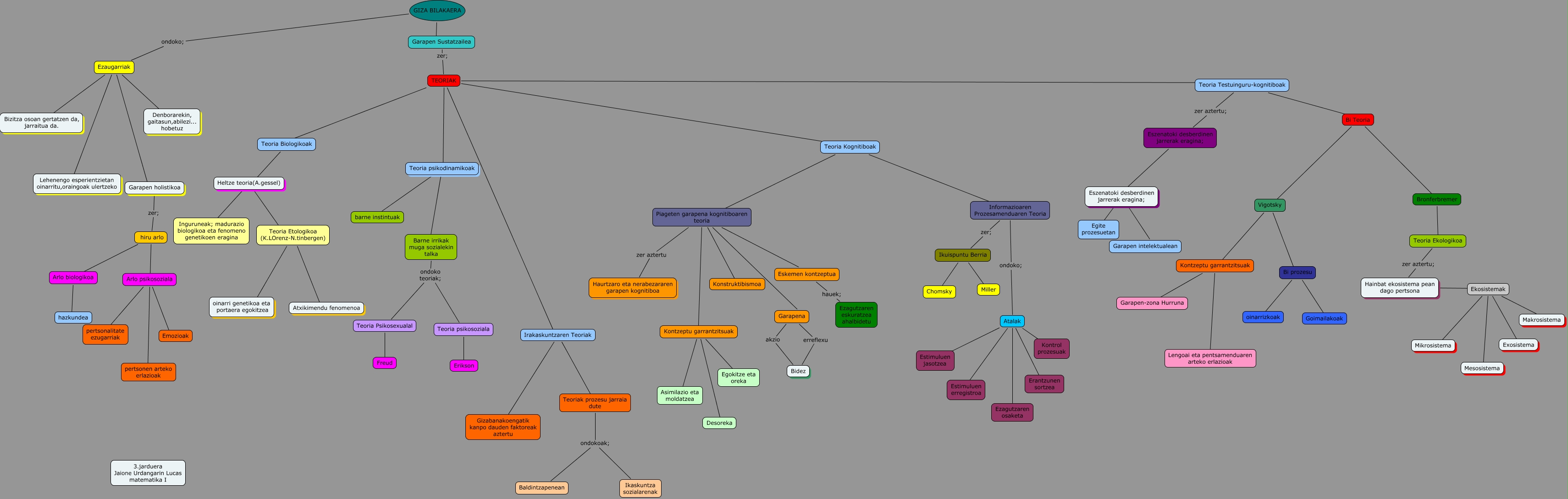 This Concept Map, created with IHMC CmapTools, has information related to: Jaione Urdangarin, Vigotsky ???? Bi prozesu, Teoria Psikosexualal ???? Freud, Informazioaren Prozesamenduaren Teoria ondoko; Atalak, Kontzeptu garrantzitsuak ???? Asimilazio eta moldatzea, Teoria Testuinguru-kognitiboak ???? Bi Teoria, Kontzeptu garrantzitsuak ???? Garapen-zona Hurruna, Ezaugarriak ???? Lehenengo esperientzietan oinarritu,oraingoak ulertzeko, Eskemen kontzeptua hauek; Ezagutzaren eskuratzea ahalbidetu, Eszenatoki desberdinen jarrerak eragina; ???? Garapen intelektualean, Ikuispuntu Berria ???? Miller, Piageten garapena kognitiboaren teoria ???? Konstruktibismoa, Atalak ???? Erantzunen sortzea, Teoria Ekologikoa zer aztertu; Hainbat ekosistema pean dago pertsona, Teoriak prozesu jarraia dute ondokoak; Baldintzapenean, Teoria Kognitiboak ???? Informazioaren Prozesamenduaren Teoria, Barne irrikak muga sozialekin talka ondoko teoriak; Teoria Psikosexualal, Ezaugarriak ???? Denborarekin, gaitasun,abilezi... hobetuz, Ekosistemak ???? Makrosistema, Garapen holistikoa zer; hiru arlo, Atalak ???? Estimuluen jasotzea