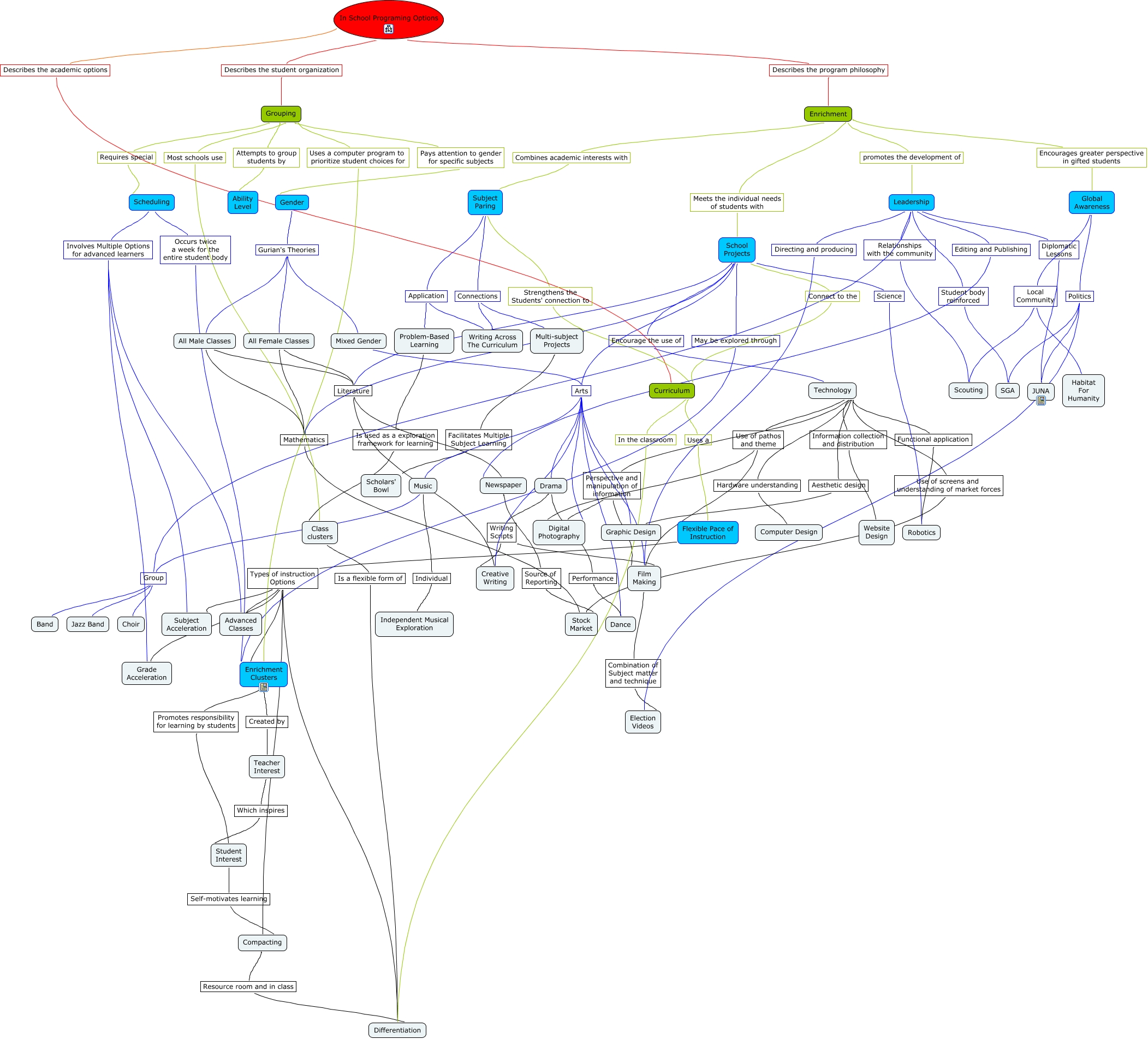 This Concept Map, created with IHMC CmapTools, has information related to: IGP - In School Programing Options, Leadership Directing and producing Film Making, Leadership Group Jazz Band, Mixed Gender Arts Digital Photography, Flexible Pace of Instruction Types of instruction Options Grade Acceleration, All Male Classes Literature Newspaper, Mixed Gender Arts Music, Drama Writing Scripts Film Making, Global Awareness Local Community Scouting, Student Interest Self-motivates learning Compacting, Global Awareness Politics SGA, Grouping Attempts to group students by Ability Level, Global Awareness Politics Election Videos, Technology Aesthetic design Graphic Design, Class clusters Is a flexible form of Differentiation, School Projects Arts Dance, Subject Paring Application Writing Across The Curriculum, Grouping Requires special Scheduling, Technology Use of screens and understanding of market forces Stock Market, Leadership Relationships with the community Scouting, Enrichment Clusters Created by Teacher Interest