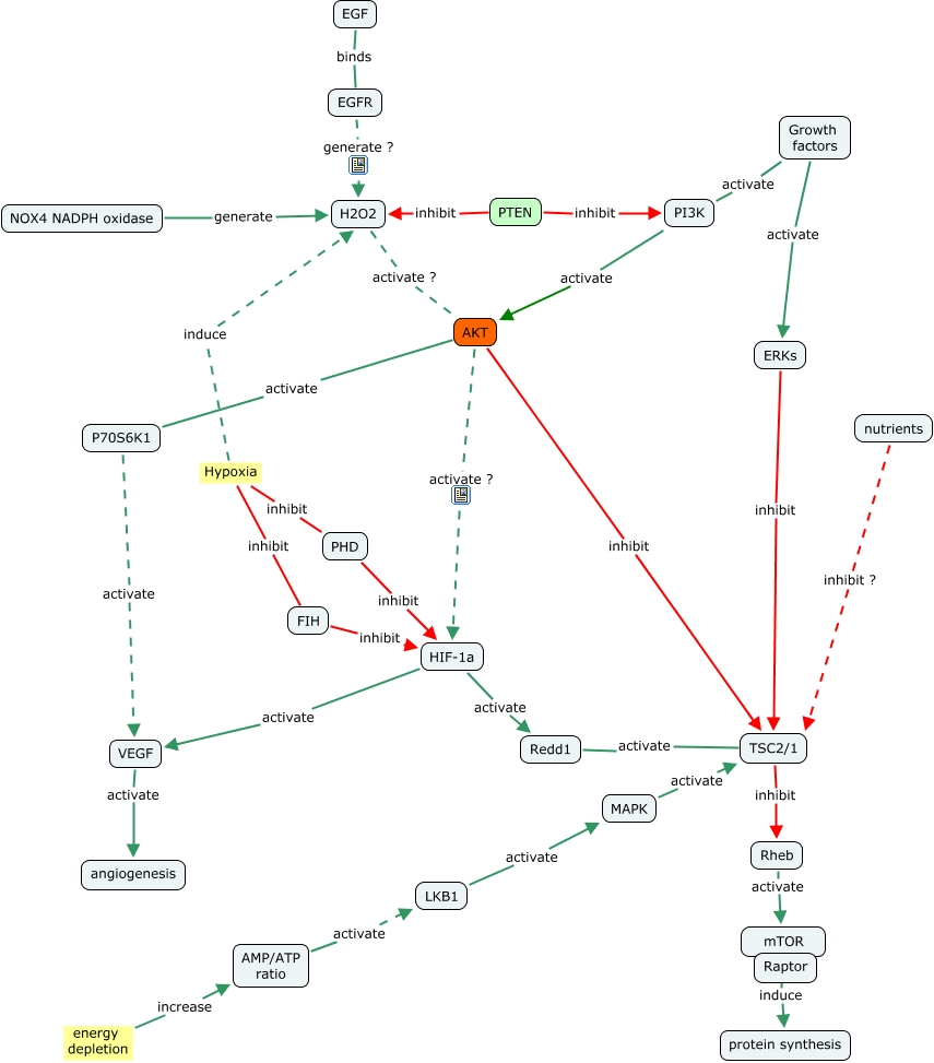 This Concept Map, created with IHMC CmapTools, has information related to: HIF-AKT-ROS, AMP/ATP ratio activate LKB1, AKT activate ? HIF-1a, NOX4 NADPH oxidase generate H2O2, Hypoxia inhibit PHD, mTOR induce protein synthesis, VEGF activate angiogenesis, AKT activate P70S6K1, PHD inhibit HIF-1a, H2O2 activate ? AKT, Hypoxia induce H2O2, Growth factors activate ERKs, EGFR generate ? H2O2, LKB1 activate MAPK, Rheb activate mTOR, Hypoxia inhibit FIH, energy depletion increase AMP/ATP ratio, EGF binds EGFR, PI3K activate AKT, TSC2/1 inhibit Rheb, Growth factors activate PI3K